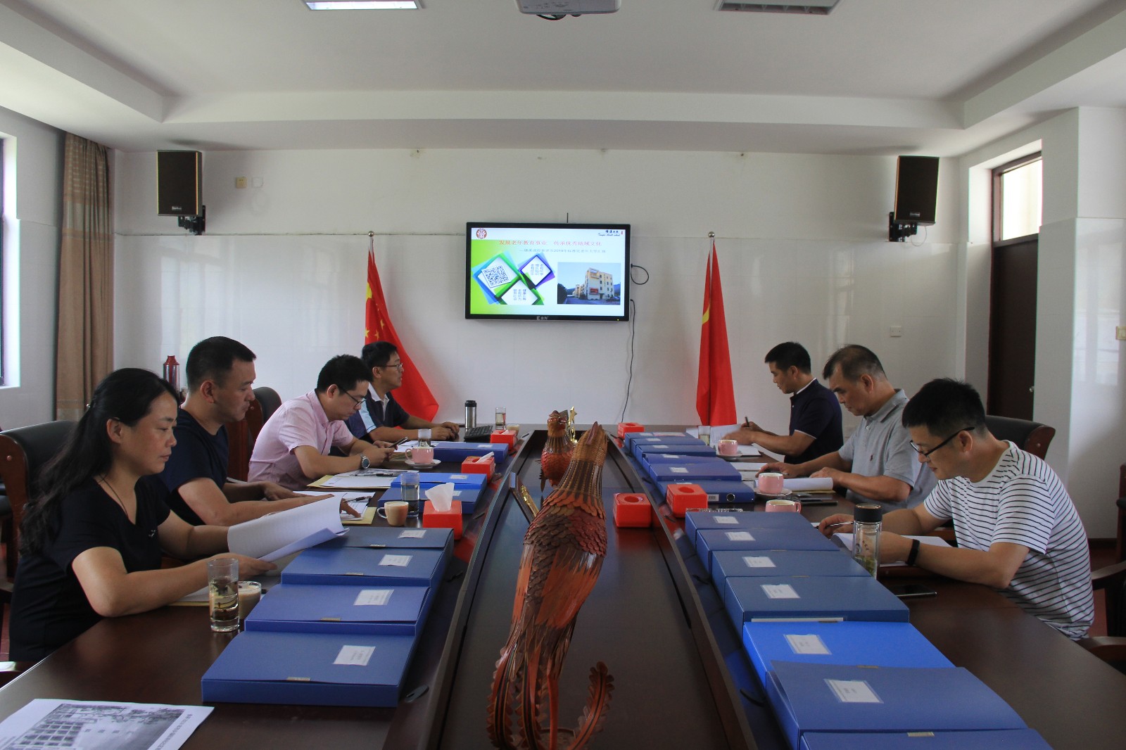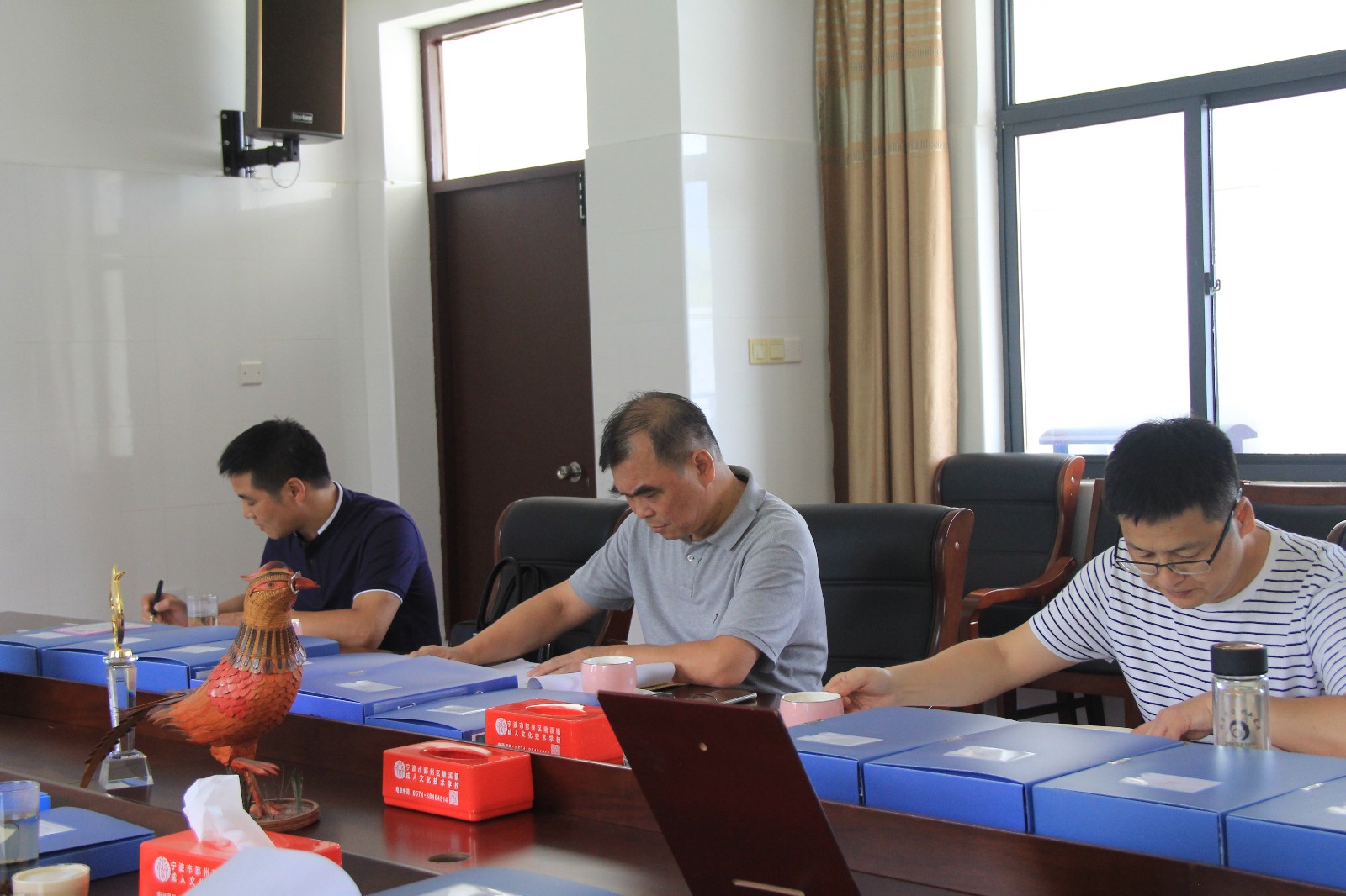 评估专家组一行人随后进入三楼会议室听取了柯国柱校长题为《发展老年教育事业   传承优秀地域文化》的汇报。听完汇报后,评估专家组及区镇领导分别做了点评。随后,评估专家组一行人还对塘溪镇老年大学办学基础、教育教学、组织管理、制度建设等相关20多盒档案进行了仔细认真地查阅评估。