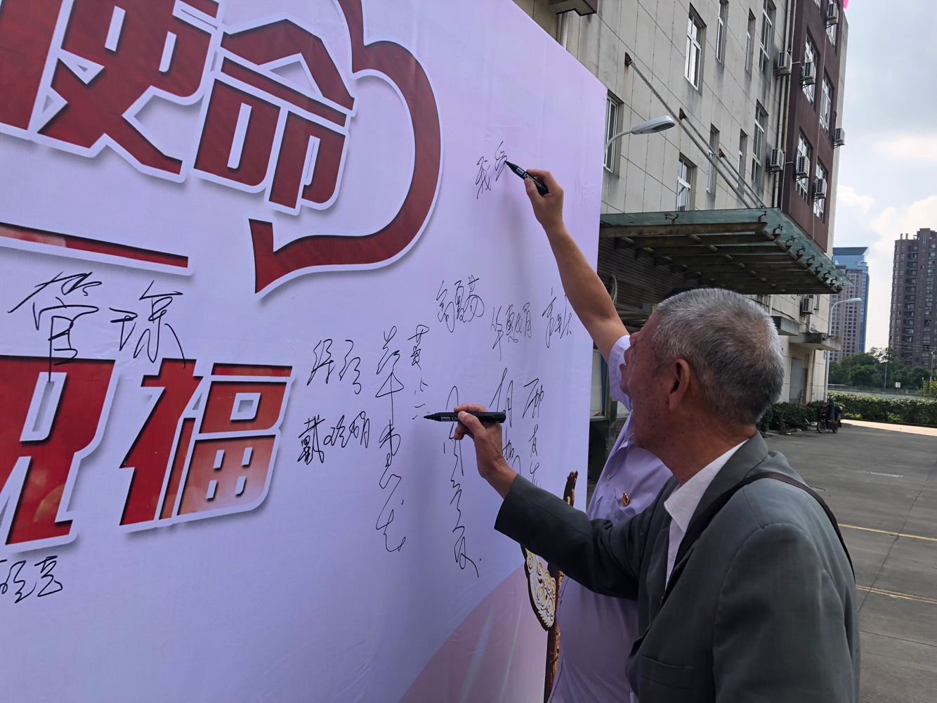 在社区大门口,立了一块醒目的“我为祖国送祝福”喷绘,合影完毕后,党员们纷纷在喷绘布上签下了自己的名字,并写上对祖国的祝福“我爱你祖国!”“祖国,让我为您添砖加瓦!”等等。短短几分钟,喷绘上写满了大家热情洋溢的祝福。
