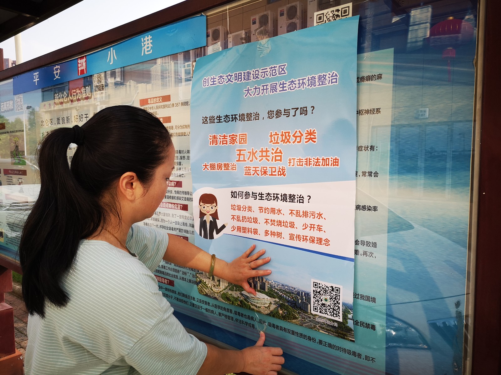 社区工作人员通过分发“五水共治”宣传资料、走访开展问卷调查,讲解“五水共治”的内容、作用和意义,引导群众树立节约用水、保护水资源的科学理念,调查公众对该项工作的满意度。同时,社区在宣传栏张贴海报、在电子屏等平台滚动宣传相关知识,使更多的居民参与到治水行动中来,共建山水宜居长山。