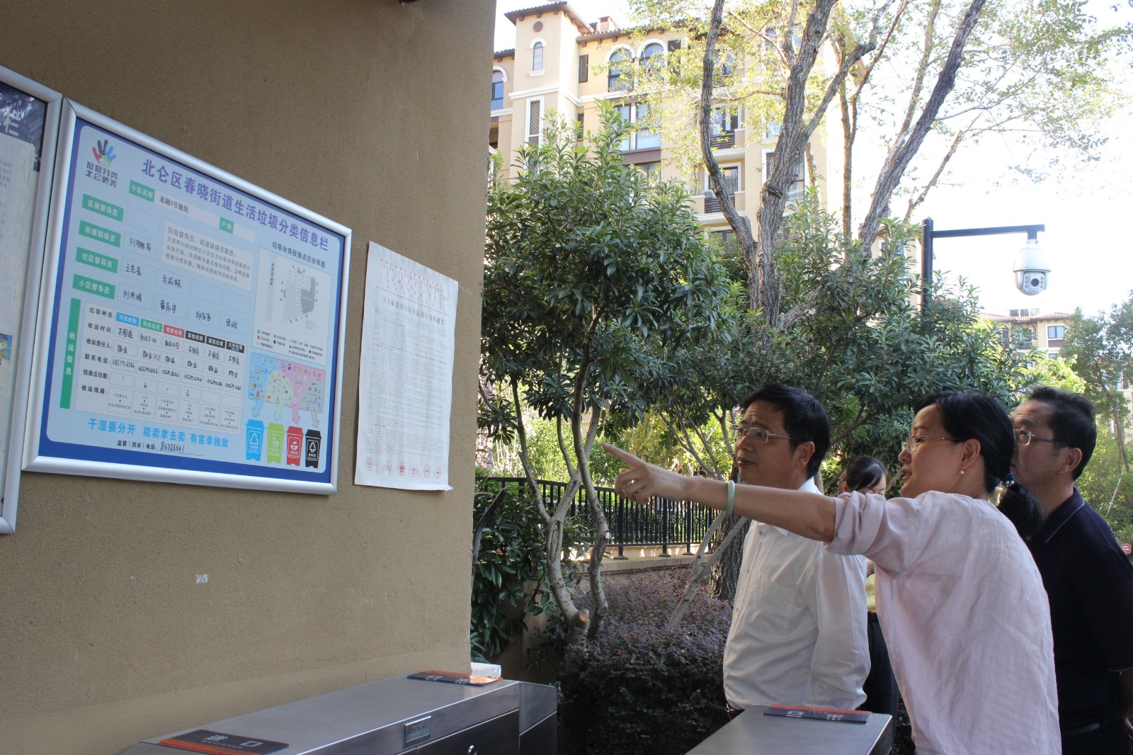区领导一行先后查看了小区垃圾分类四色点位、宣传阵地、分类设置的布点运作模式等,详细了解洋沙山社区的垃圾分类运行情况,并对春晓街道的生活垃圾分类工作给予肯定。