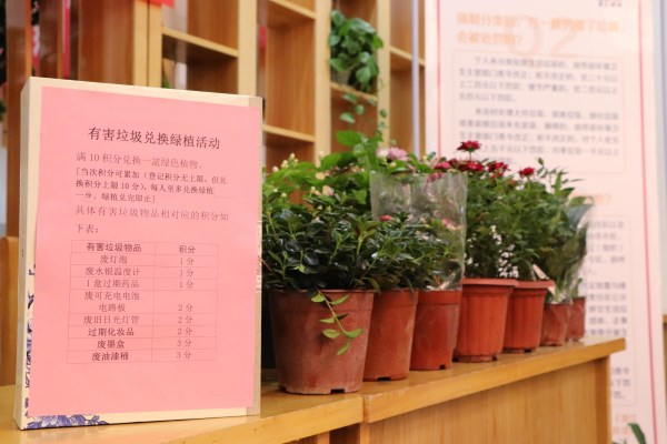 社区教育志愿者们早早摆好宣传摊位,准备好绿植,等着居民来领它们回家,将爱延续。此次垃圾分类积分兑换活动的兑换标准为:废灯泡、过期药品等积1分,过期化妆品、灯管类积等2分,其他类如废油漆桶等积3分,积分可用来兑换绿植品。