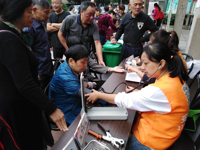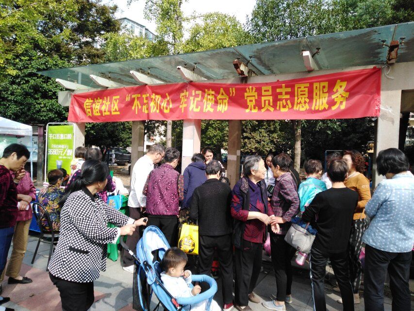 为了更好的开展社区志愿服务工作,为辖区居民提供方便、优质、实惠的便民服务。10月16日上午。信谊社区党总支组织社区党员志愿者在汇景新苑小区广场开展了“不忘初心,牢记使命”党员志愿便民服务。一大早,广场上就热闹非凡。便民常规服务项目有理发、修鞋、磨刀、洗眼镜、量血压、测血糖,还有眼科、耳科、口腔科咨询检查,有害垃圾置换、人文旅游及便民果蔬义卖等。活动现场,党员志愿者们耐心为居民们进行引导及解答各类问题,为居民提供了便利,得到了居民的一致好评。