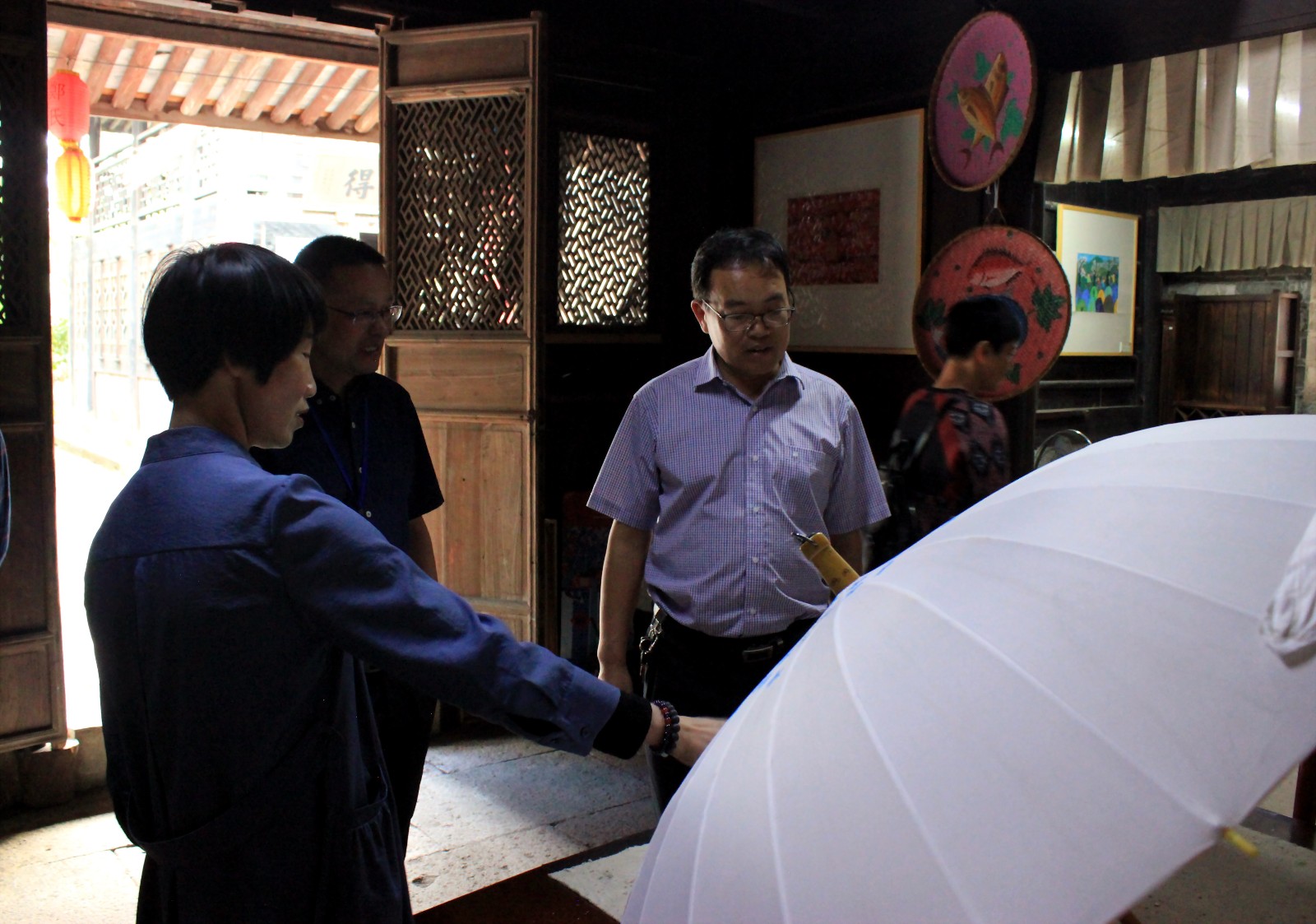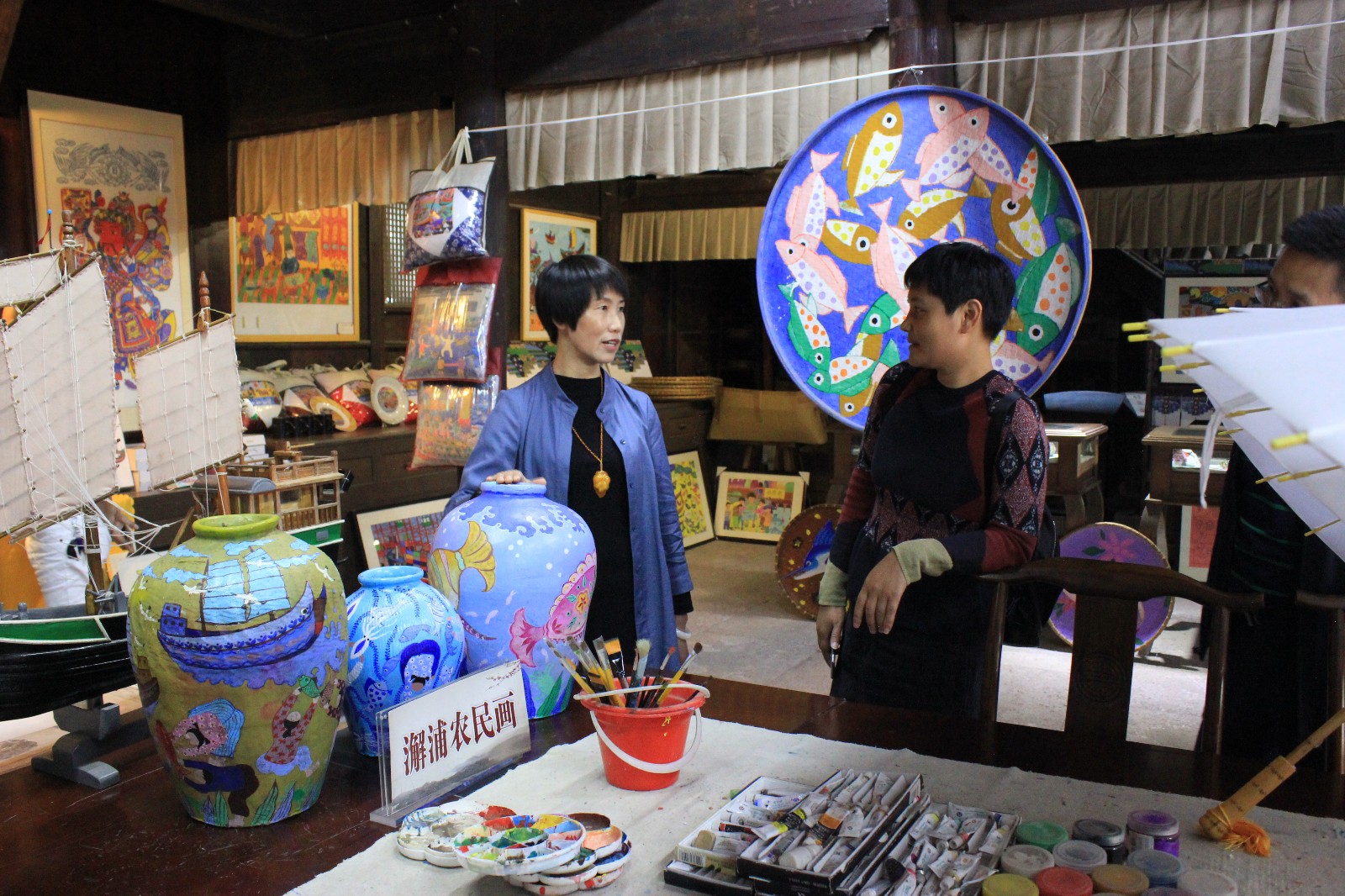 首先,校长刘奇华带领大家参观了学校的实训设施、教学环境及学校近几年取得的成果展示。接着,听取了刘奇华以“项目创新引领 社区教育品质化发展”为题的工作汇报,在简单介绍了澥浦镇及学校的概况之后,从海田阿姨家政服务培训、“学院式”社区矫正教育、政府主导的乡镇老年大学、“五位一体”农民培训、“蓝色融合”新市民教育、心理健康服务进社区和小成校服务大园区等七个方面阐述了学校的办学特色项目。听取了汇报后,来宾们还参观了澥浦农民画基地。在农民画传承人高妮娥的介绍下,了解了农民画的发展、演变历程,对各色农民画的衍生品产生了浓厚的兴趣。