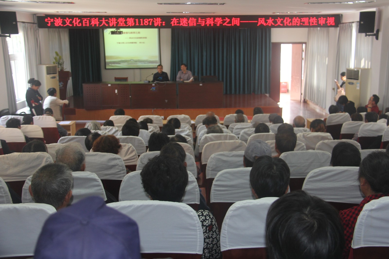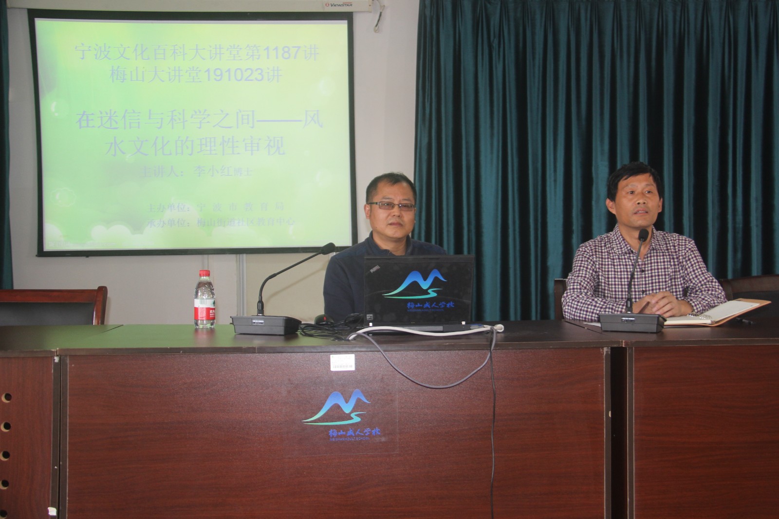 梅山成校邀请了宁波大学副教授李小红博士作了题为《在迷信与科学之间—风水文化的理性审视》的讲座,在梅山成校二楼报告大厅有近130名社区居民聆听了讲座。