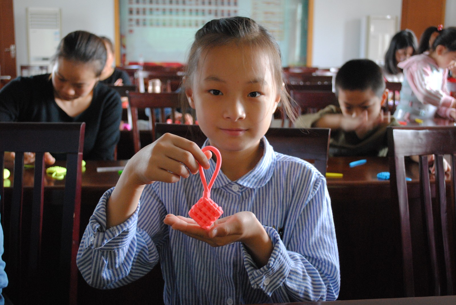 在活动开始前,老师先向家长和孩子们讲解中国结的来历、含义,并通过PPT形式展示了各式各样的中国结,让大家对中国结所认识。接着,社工拿出准备好的超轻黏土,让孩子跟家长一组,开始中国结的制作。孩子们按照步骤,先把粘土搓成圆,随后搓成长条,等分,切成块状,再次搓成长条,宽度相当,中间用尺子划痕,拼接。最后配上彩色的黏土制作成的“小钻石”作为装饰。在制作过程中,老师特别强调:黏土一定要晾干或者半干,否则会糊在一起;如果有“小部件”掉了也没关系等晾干之后,用白胶再次固定。家长们和老师认真细致在旁协助,不亦乐乎。制作的同时,大家互相交流。当自己心目中美丽的中国结制作完成时,孩子和家长都露出了满意的微笑。