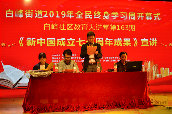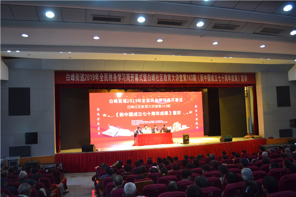 为深入贯彻落实党的十九大精神和省、市教育大会精神,加快建设学习型社会,推动全民终身学习,10月31日,由白峰社区教育中心承办的白峰街道2019年全民终身学习活动周开幕式兼《新中国成立七十周年成果》讲座在白峰影院举行,白峰片区域党员、群众500余人参加了本次活动。