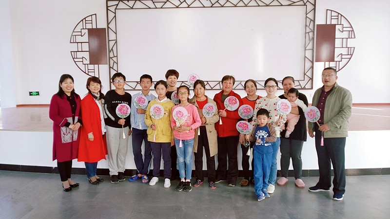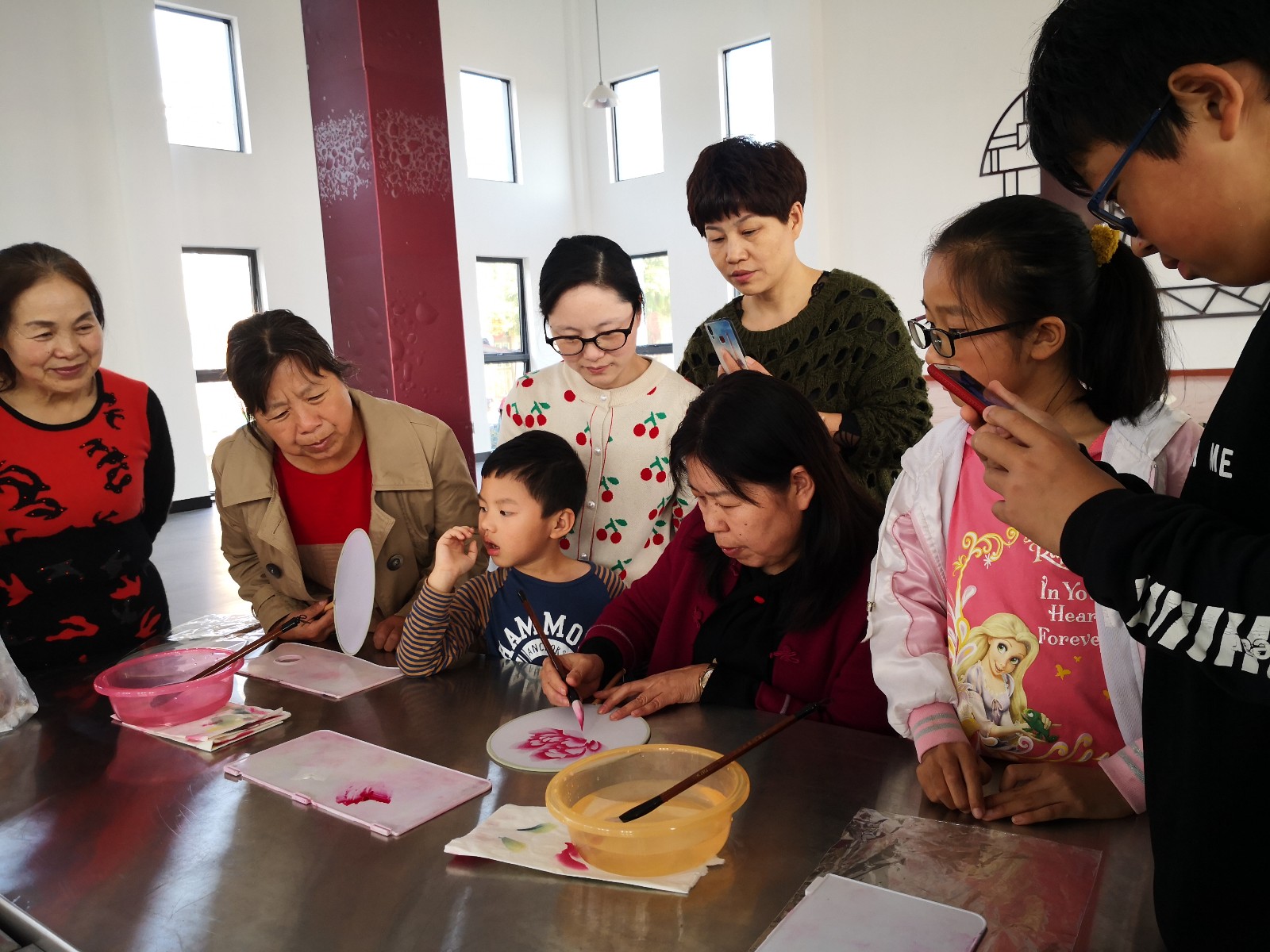 在刚刚落成的杨陈村文化礼堂,村妇联主席黄红霞已和10余位村民早早等候。简单的布置后,张老师开始在一只素白的小团扇上示范,从用笔、调色、构图等基本的要领开始,再到团扇上作画,张老师边画边讲解,很快,一朵娇艳的牡丹就盛开在团扇上,大家跃跃欲试,都想画出自己的牡丹。在老师的鼓励下,每位学员终于画下了自己的第一笔。战胜了胆怯的学员们,在张老师、李老师的指导下,兴趣更加浓厚,不大一会儿,牡丹的雏形跃然于团扇上,添上枝叶、点上花蕊,每个人都完成了自己的牡丹处女作,兴奋之情,溢于言表,也在不自不觉中、恋恋不舍地结束了一个半小时的牡丹课。
