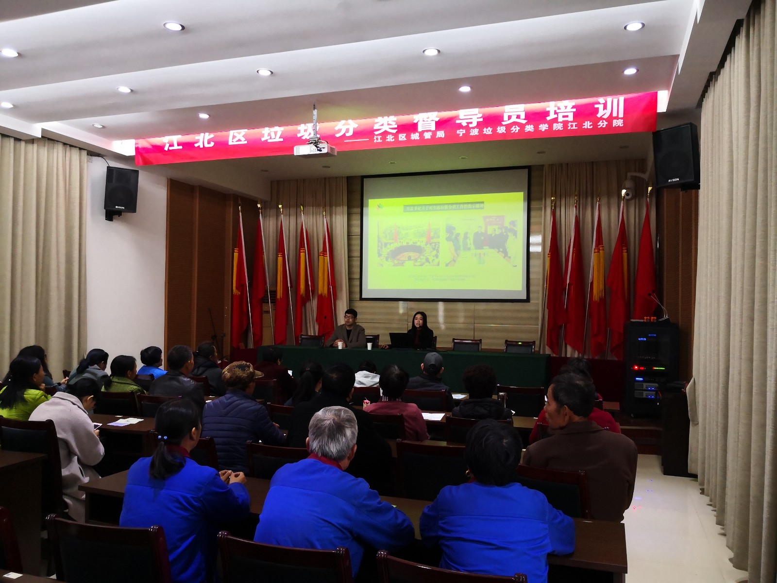 2019年11月21日,由江北区城管局举办、宁波垃圾分类学院江北分院承办的“江北区垃圾分类督导员培训”在江北电大报告厅举行。