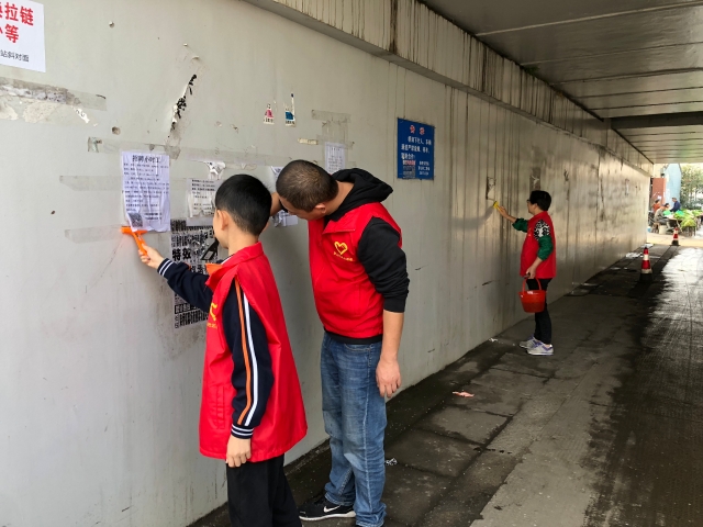 穿山社区志愿者们组团深入各村道,进行环境“大清洗”。有的是父子团、有的是闺蜜团,按个子高矮分组分工行动。大家拿着水桶、铁铲、抹布、金属丝球、垃圾袋等工具,仔细地清除墙壁、电线杆上的小广告,贴纸等牛皮癣。有负责打水的,有负责清扫脱落牛皮癣和地面垃圾的,有负责清理高处贴纸的,从手撕到抹布擦再到铲子铲,经过大家三个小时的辛勤劳动,墙面电线杆又恢复了干净的状态。
