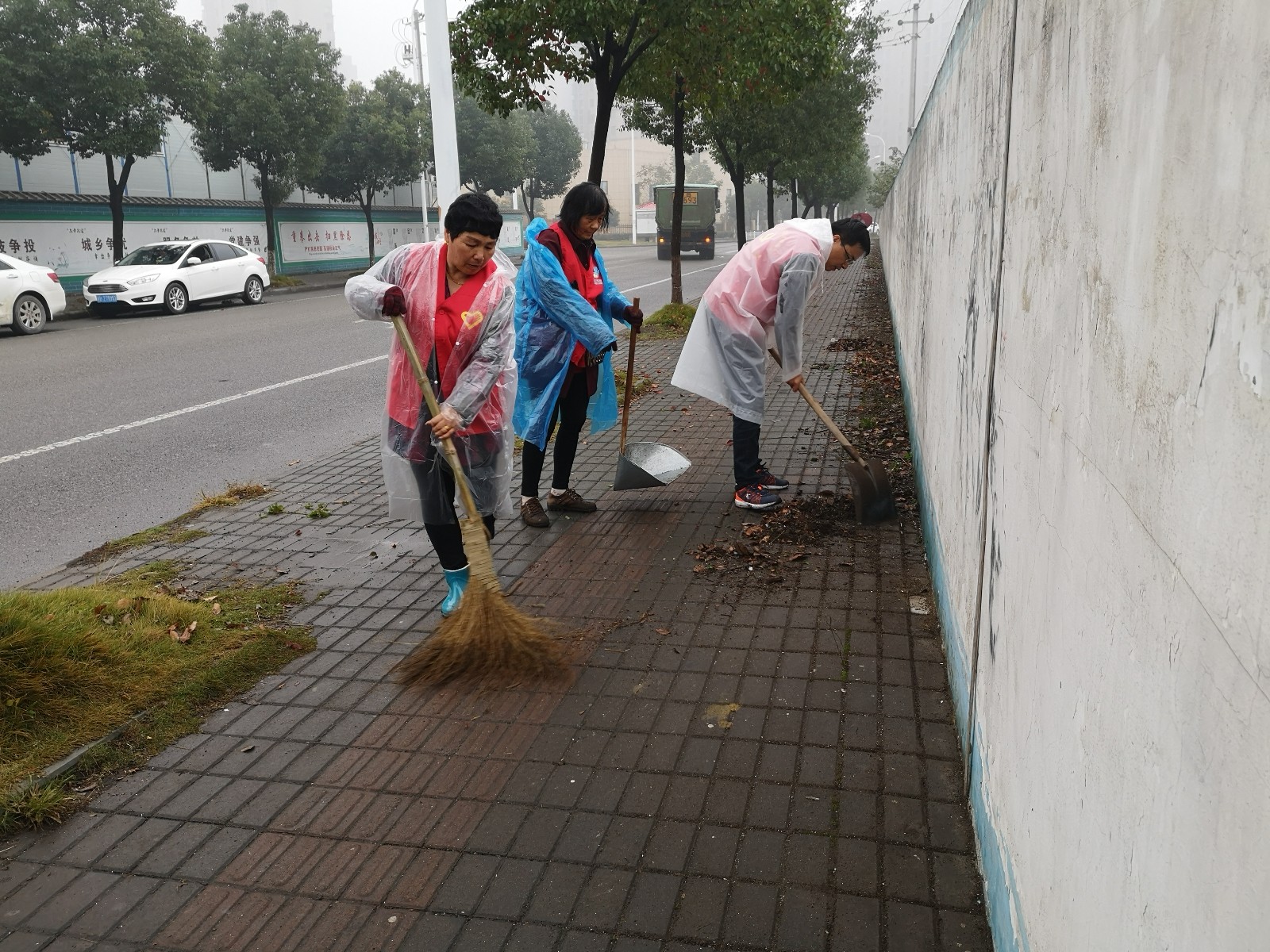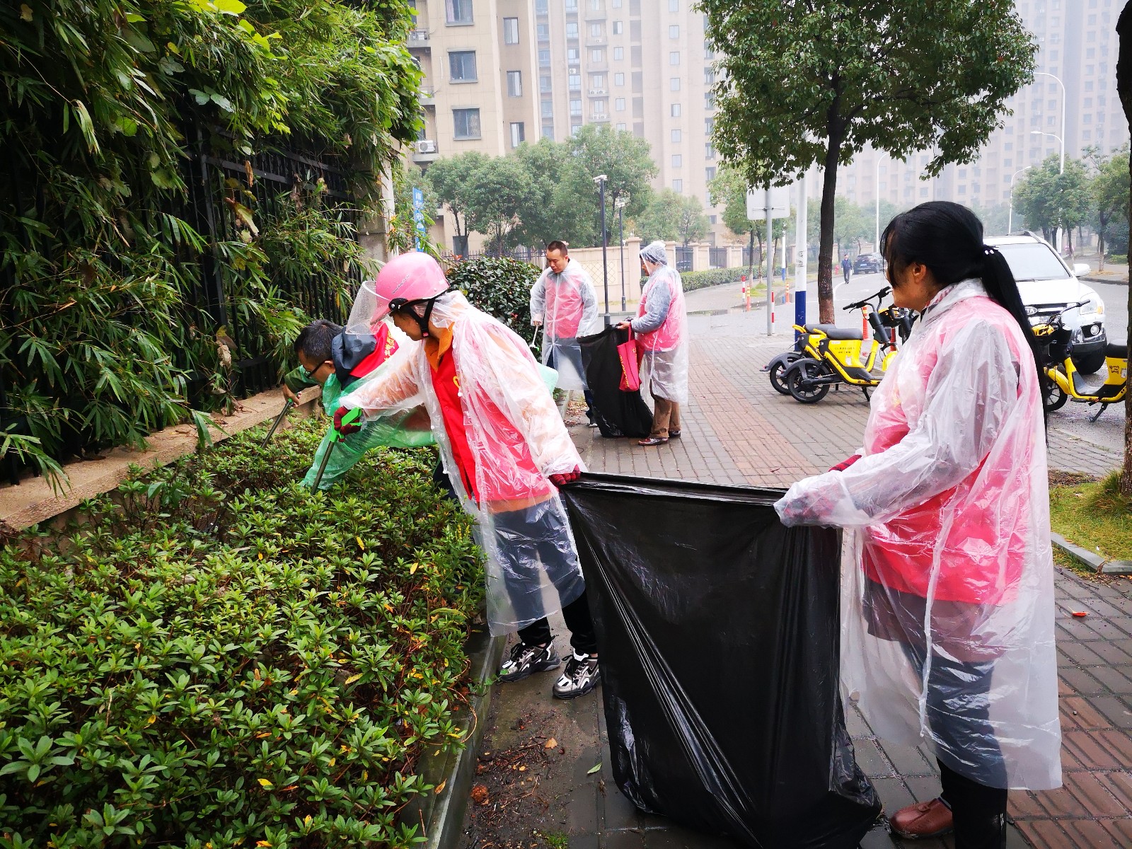在社区工作人员的带领下,“清洁家园”队伍放弃周末休息时间,连续多天冒着细雨寒风,兵分两组进行清理活动。他们有的清扫道路,有的捡拾烟头、废纸等,还有的对花草丛内躲猫猫的细小垃圾进行清理,以实际行动来当环保卫士,忙的不亦乐乎。风雨中的红马甲分外红,党员们身先士卒,挥动铲子、扫帚等劳动工具,用热情征服卫生死角。