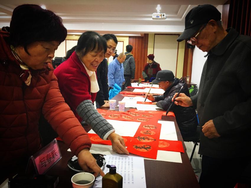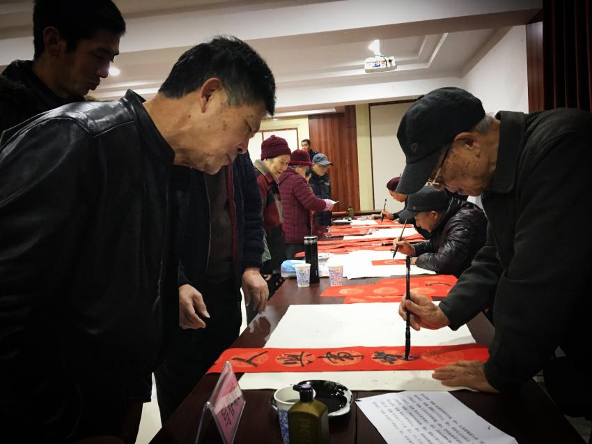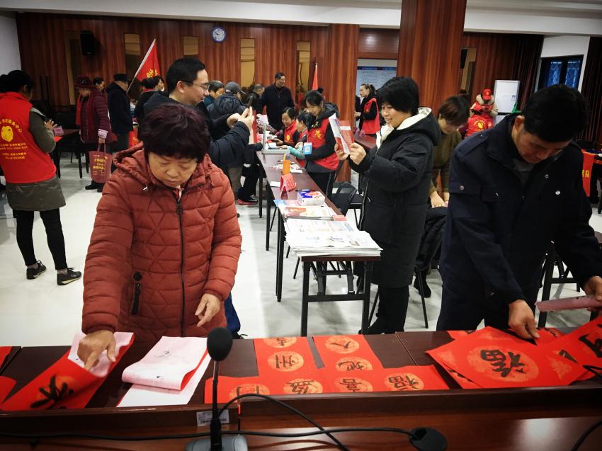 虽然天气很冷,但一点不影响居民前来参加活动的热情,桌子上铺开了喜气大红纸,活动现场来自社区春晖书画社的成员们现场挥笔,洋洋洒洒写下了充满着浓浓年味、喜庆大红的春联,居民兴致勃勃的欣赏并挑选自己喜爱的作品回家。正值下雨天,来修伞的人群更是络绎不绝,还有磨刀、理发等等,每一项面前都排满了人群。