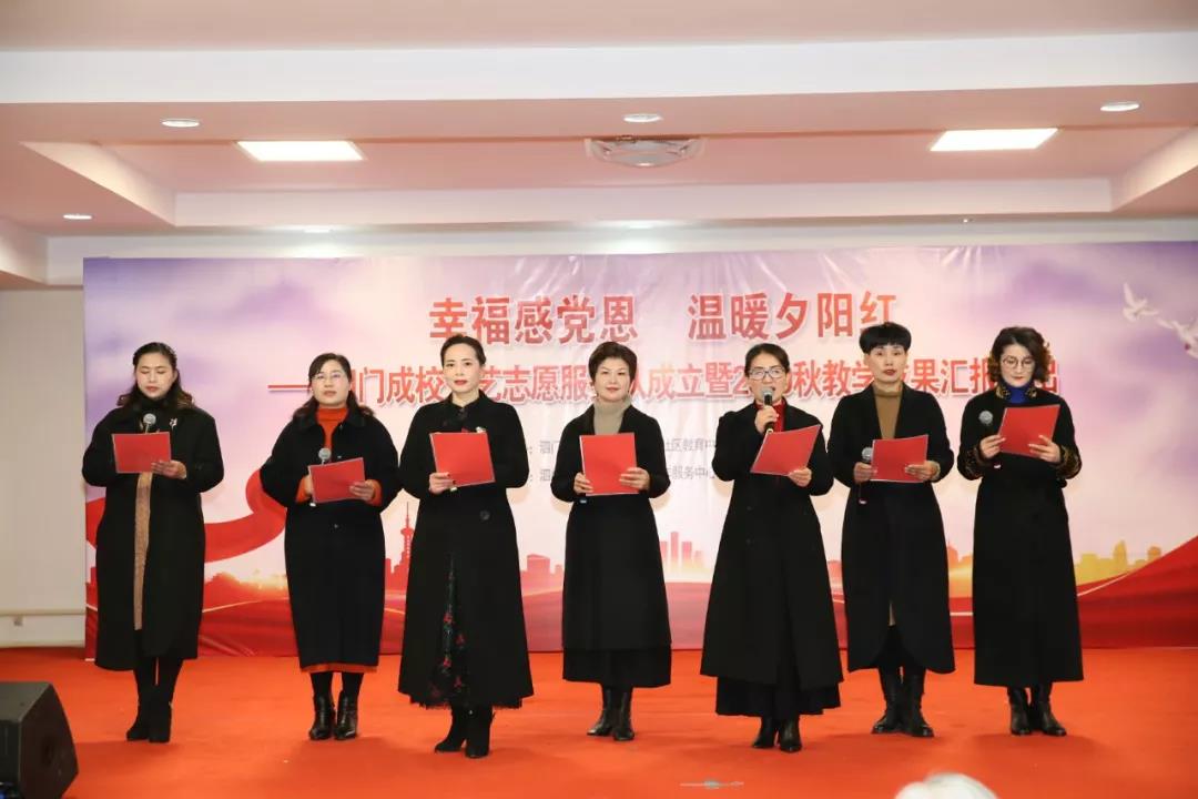 下午一点整,主持人张宇虹闪亮登场后进行第一个环节——泗门成校文艺志愿服务队实践点揭牌仪式。为了弘扬敬老、爱老、助老的传统美德,丰富广大老年朋友的业余文化生活,泗门成校联合泗门老年人服务中心成立了一支文艺志愿服务队,并把泗门老年人服务中心设为服务实践点。服务队将秉承奉献、关爱、互助、进步的志愿精神,不定期的开展送文艺送关爱活动,结合传统节日庆祝,常态化的坚持下去。