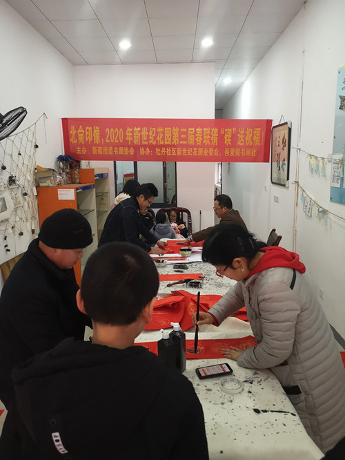 古墨轻磨飘香,一支支饱蘸祝福墨的毛笔,横竖撇捺,如春风拂面,落在一张张鲜红的对联纸上,浓浓的年味儿飘满了小区新世纪花园。1月5日下午,牡丹社区吾爱阁书法社联合新世纪花园业委会开展了“第三届春联猜‘碶’送祝福”义写春联活动。