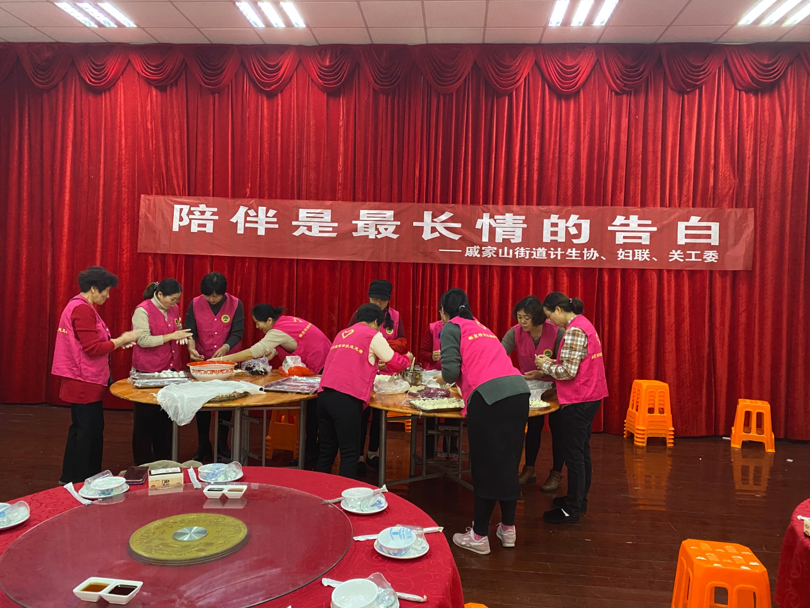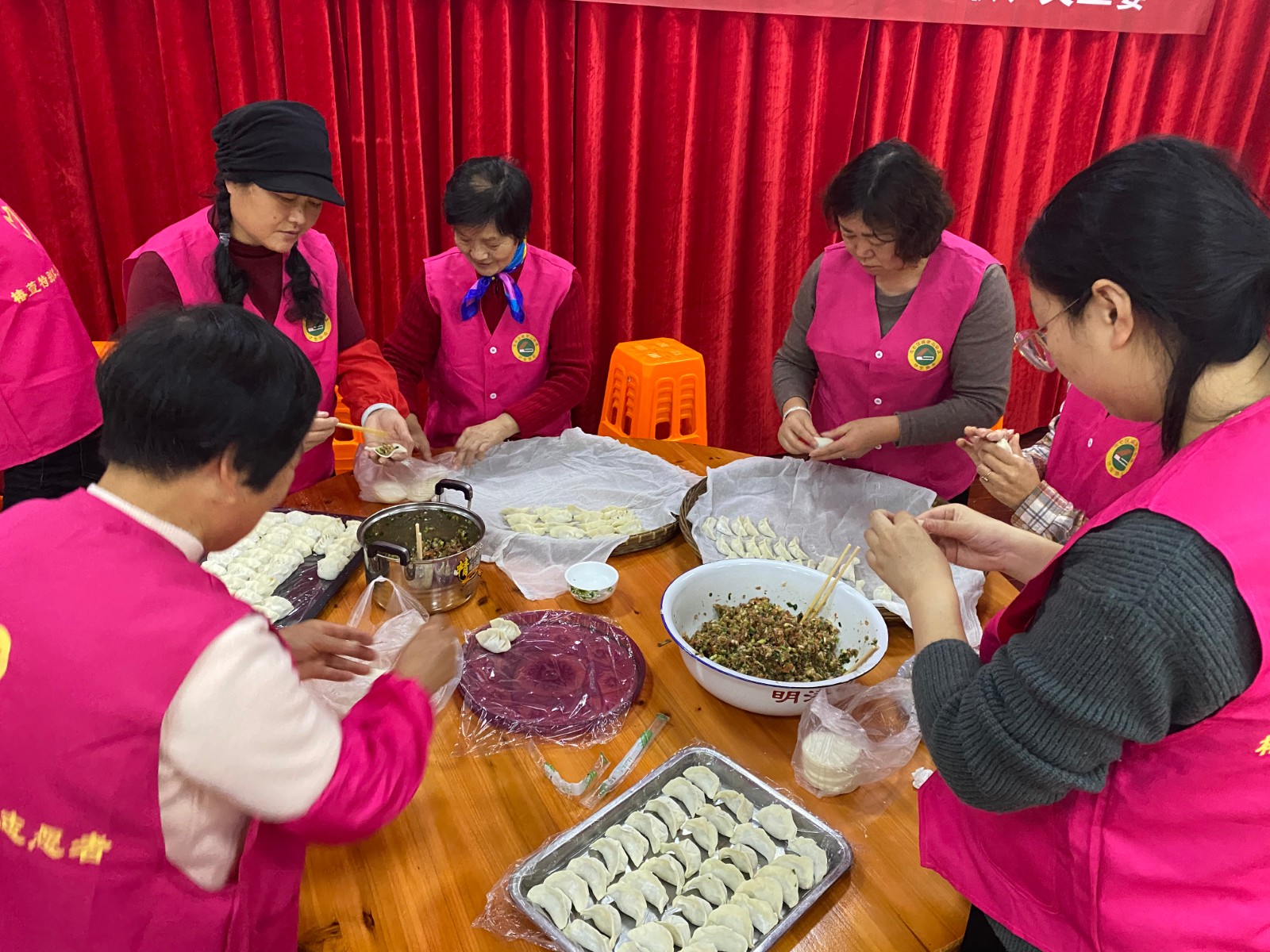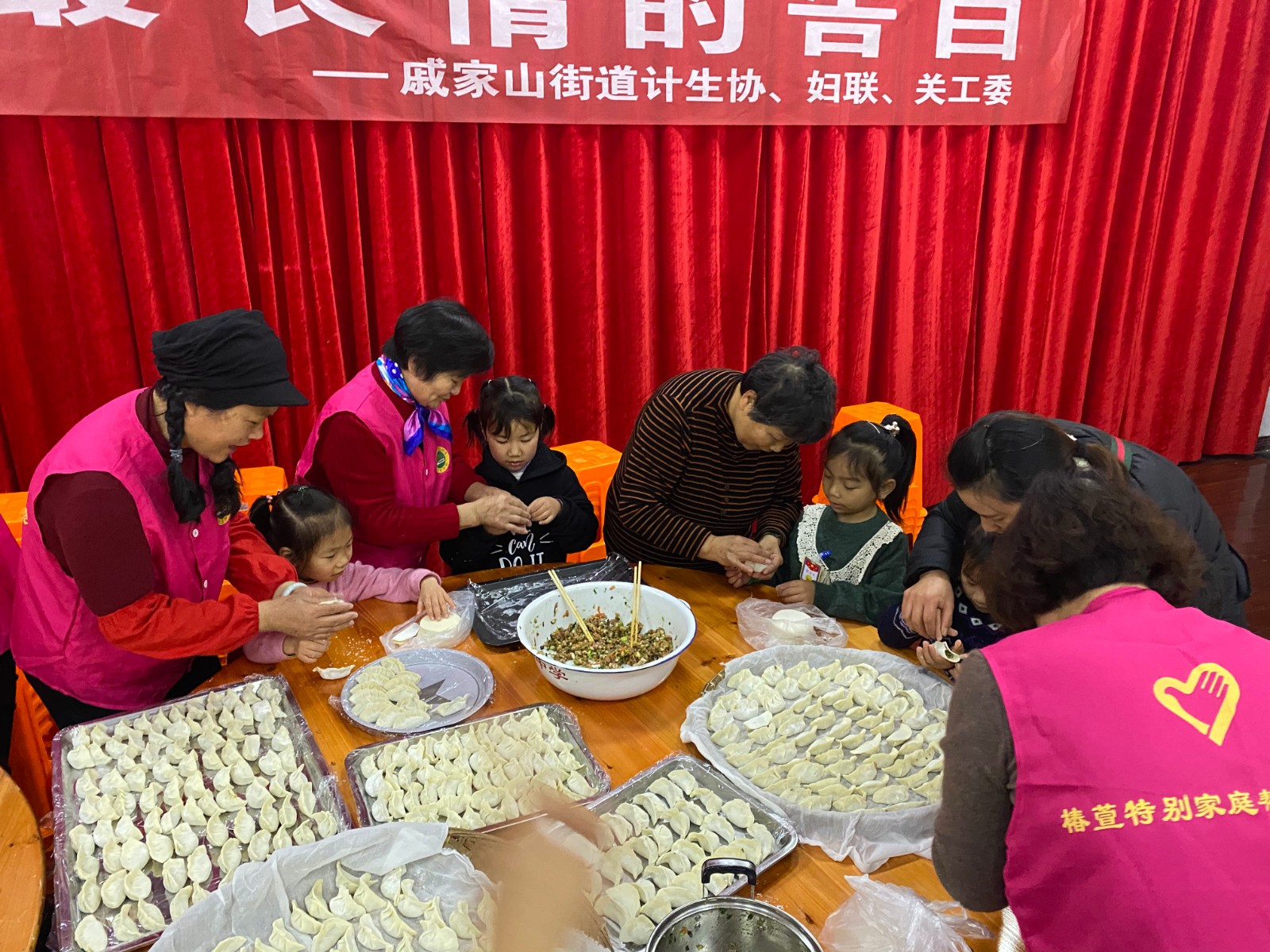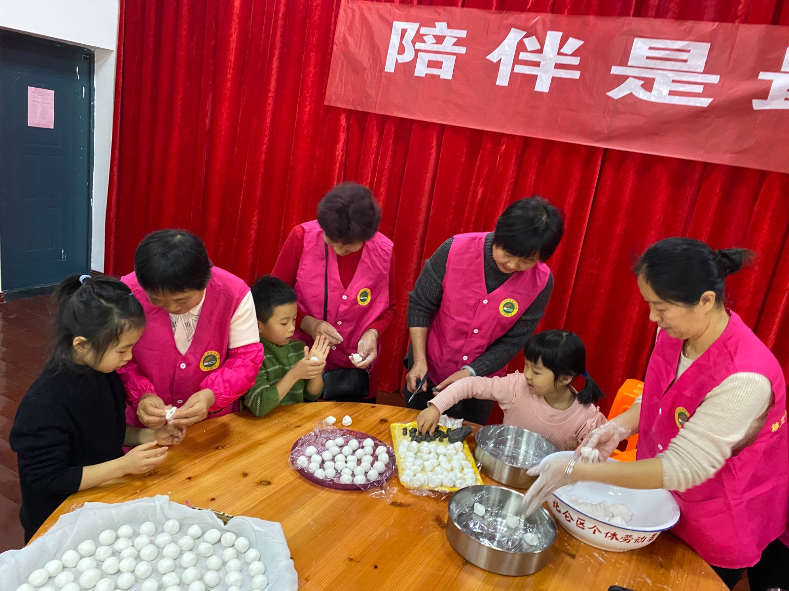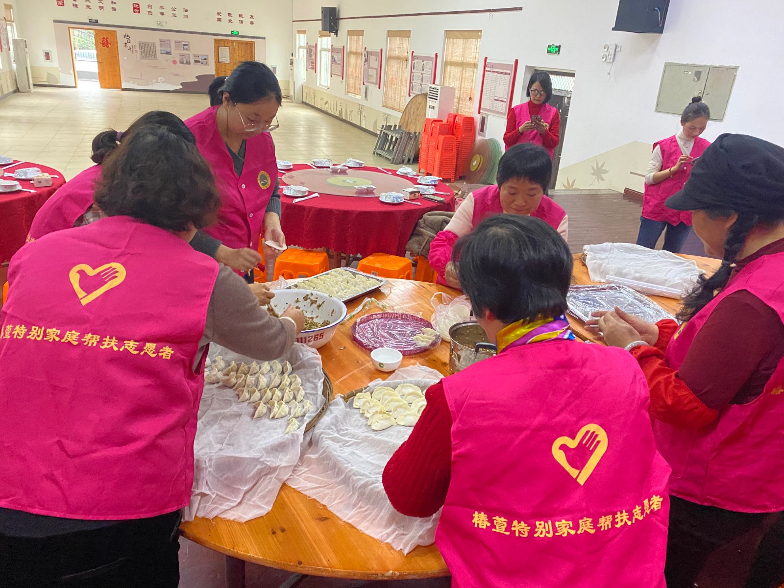一早,椿萱志愿者们就为了中午的年夜饭主食而忙开了,饺子皮、猪肉馅、糯米粉、猪油芝麻馅在两张大桌上摆放起来。计生特殊家庭阿姨和志愿者们手把手地教小朋友们包水饺、搓汤团,其乐融融。随后,小朋友还为计生特殊家庭献上了鲜花,祝福他们新年快乐。开席前,大家还共同录制了新春祝福的视频。
