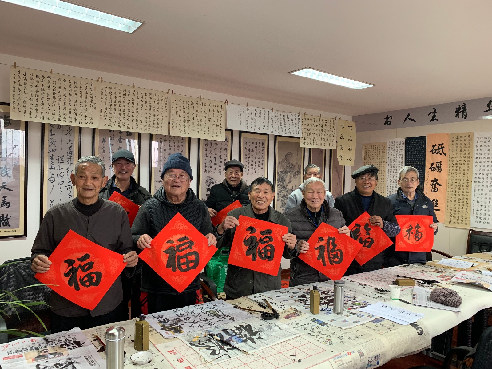 110日一大早,书法班的成员们就忙的不亦乐乎,他们挥毫泼墨写着福字,一个个福字跃然纸上,此次的福字将送给辖区居民,寄托着大家对新春的憧憬和向往。社区工作人员有的帮着递纸墨,有的帮忙晾晒福字的墨迹,活动现场洋溢着欢快、祥和的年味。最后,社工向成员们分发了宣纸,希望大家来年再接再厉,继续参加社区活动。“感谢社区为我们提供这么好的环境,让我们退休了也有好去处。开春了我们再来。”顾大伯笑着说。