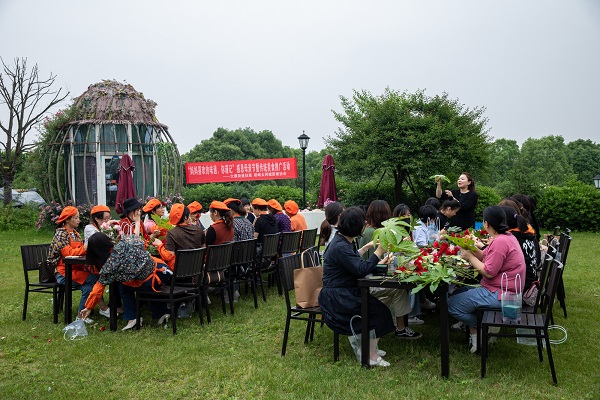 花艺老师精心准备了花篮、花泥以及各类鲜花,向现场的女同胞们讲授如何艺术插花。她先带领大家认识了手中的花材,其中有玫瑰、康乃馨、雏菊、栀子花,还有一些搭配使用的八角金盘叶。随后,老师开始一步步教大家插花:“先插主花,这边插一个面……大家在剪枝的时候要留有余地,不要一剪子下去太多……”大家认真观察着老师的动作,一边看,一边拿着自己眼前的花进行对比,琢磨着如何下手。学员们在老师的指导下,跟着老师的节奏,认真学习、发挥想象,一步一步创作着各具特色的插花作品。经过一个多小时的创作,一篮篮灿烂缤纷、新颖别致的插花作品“新鲜出炉”。活动现场还有塔峙大阿嫂带来的各类手工糕点供大家一起品尝。