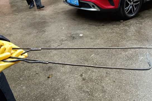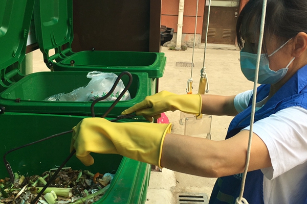 邓阿姨介绍神器说,街道和社区分的钳子一个太长,一个不好夹。为此她很是苦恼,和制作模具的老乡不经意吐嘈了督导员工作的难处,老乡立刻热心地为她定制了分类“神器”。邓阿姨现场操作了一番,她先用刺棍戳一下居民投放的厨余垃圾袋,发现有硬物或沙沙作响就判定有其他垃圾混装,就用曲刀棍割开厨余垃圾袋,把其他垃圾用曲刀棍勾出来,放到其他垃圾桶,完成二次分拣。