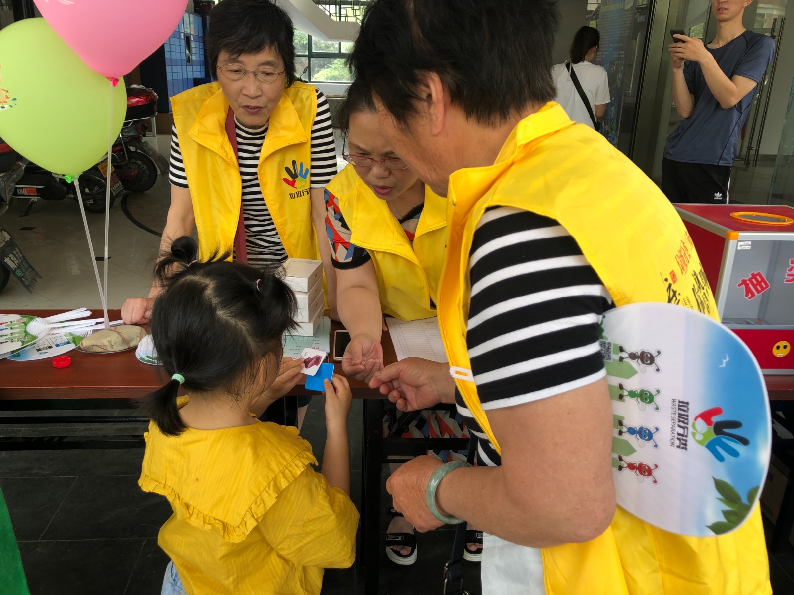 活动现场布置了小朋友们喜欢的“小猪佩奇”模样的气球,志愿者阿姨们身穿垃圾分类四色人偶服,引得不少孩儿们驻足围观。每位参加的孩子可以转动转盘回答分类,也可以在抽奖箱里抽取卡片,交给对应的穿着人偶服的阿姨。不少题目有些对于一些孩子有些难度,“分类专家”志愿者们耐心地教导他们:“海绵是其他垃圾,不能回收,也不能给小猪吃的,就是其他垃圾。”寥寥几句,通俗易懂,孩子们马上就领会了。答对的孩子可以领取一份纪念品,小小的风扇收获夏日清凉。