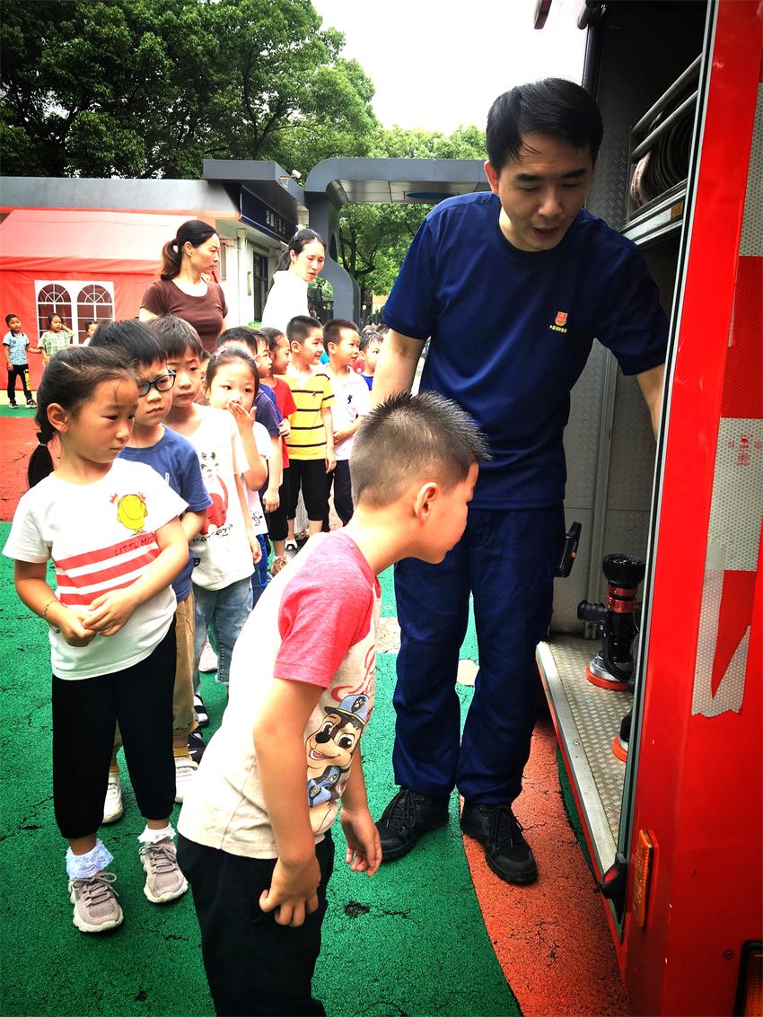 现场演练结束后,派出所义务消防员将微型消防车开进了幼儿园里面,小朋友们看到消防车非常激动。消防义务员首先向全体师生讲解了消防车的内部结构和使用方法,并与幼儿们亲密互动。