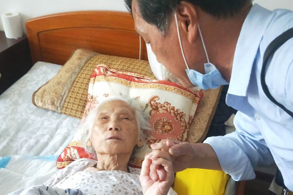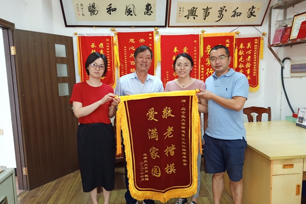 送锦旗来的是前几天去世的96岁抗日老兵遗孀庞老太的孙女,老太是北方人,她原有个幸福的家庭,丈夫是学校的教导主任,也是个参加过抗日战争的南下老兵,他们身边原有二子一女,子孙满堂,不幸的是丈夫走了,两个儿子也因病因车祸去世,女儿又患上了中风,留下终身残疾,本可照顾老母,却成了别人照顾的对象,媳妇和孙辈忙于工作,不能整天陪伴。老人年迈了行动不便,社区分院老年协会成为照顾她的一份子,爱心送餐上门,爱心理发上门,老人的结对助老志愿者更是隔三差五上门与老人聊天,帮老人做家务,老人开心家人也放心。三年前,老人有次使用微波炉烤馒头,使用不当差点爆炸,一家人为此担心,为了安全,老人入住了敬老院,但让老人放心不下的是家里的晚辈,她要求入住离家近的敬老院,而该敬老院已经满员一时进不去,老人很伤感,老年协会做了好一番工作,去年三月,老人终于如愿入住。此后老年协会的志愿者仍然经常上门探望,周围同住的老人,都以为志愿者是她的儿女,纷纷夸她好福气。今年五月,老人临终,口中喃喃呼唤着志愿者的名字,庞老太的孙女为表达对社区老年协会的感谢,特意送来了锦旗。