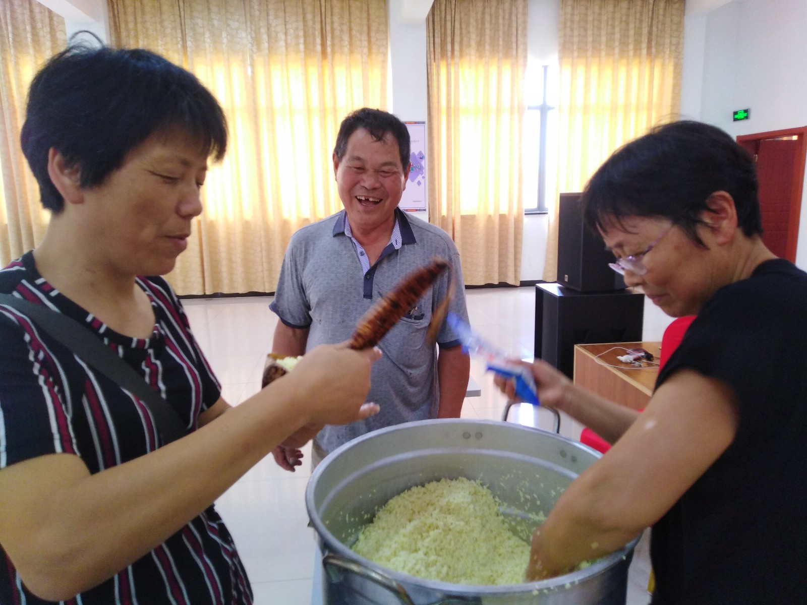 下午一点,里洞桥村村民们陆续入场,活动在大家的欢声笑语中开始了,每个包粽子区域都围满了村民,大家说说笑笑围站在一起,拿提前泡好的粽叶用勺子舀糯米,非常熟练地在包粽子,一双双灵巧的手把自己对节日的热爱全都包进了美味的粽子里,大家唠着家常,说着心里话,不一会一锅锅热气腾腾的粽子就出了锅,浓浓的节日气氛拉近了村民的心。