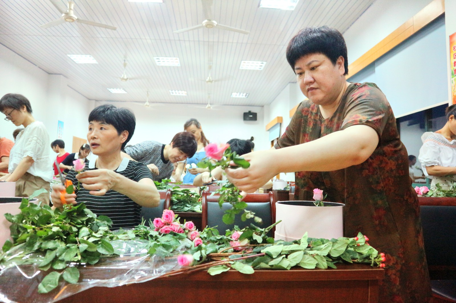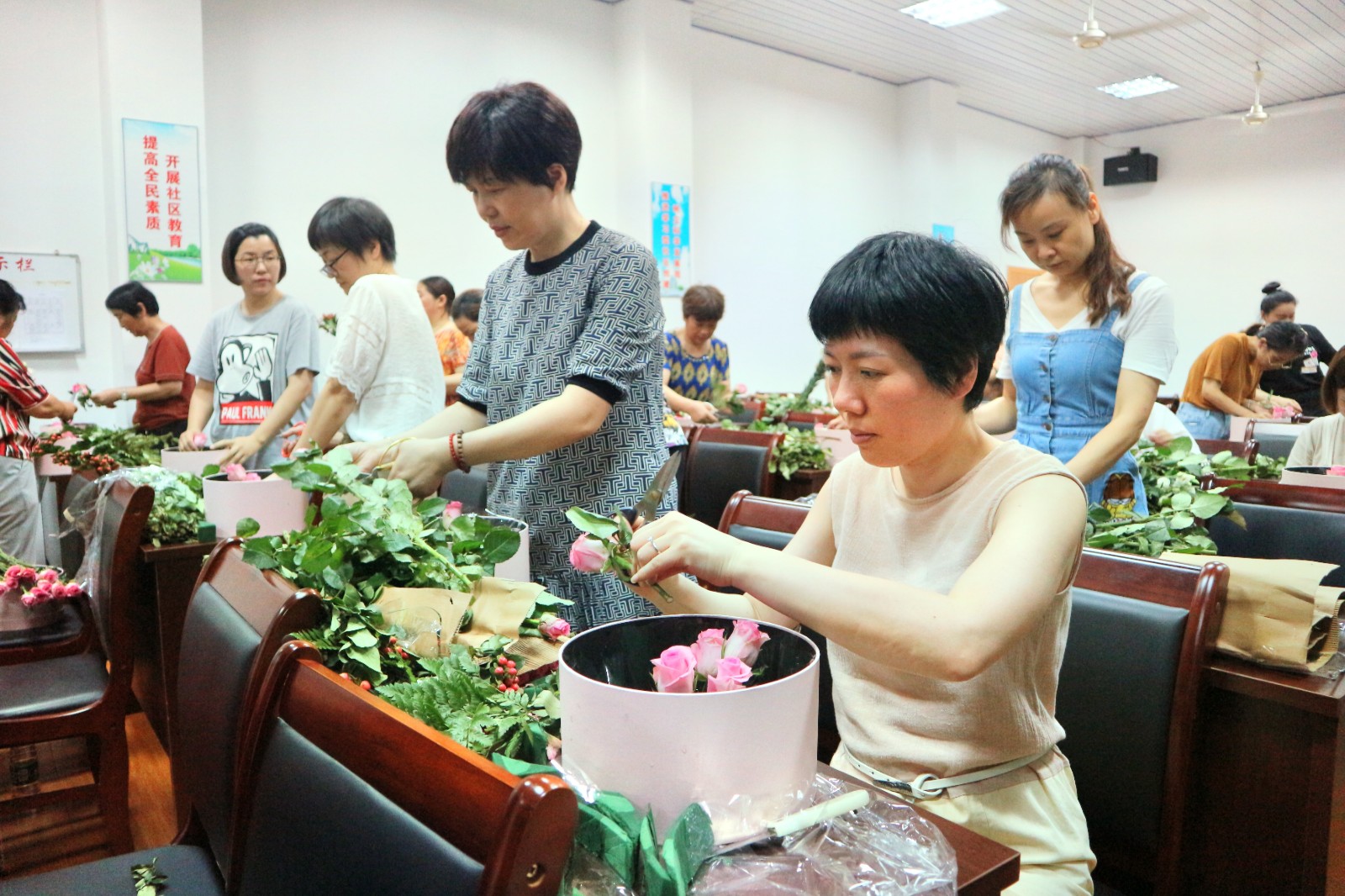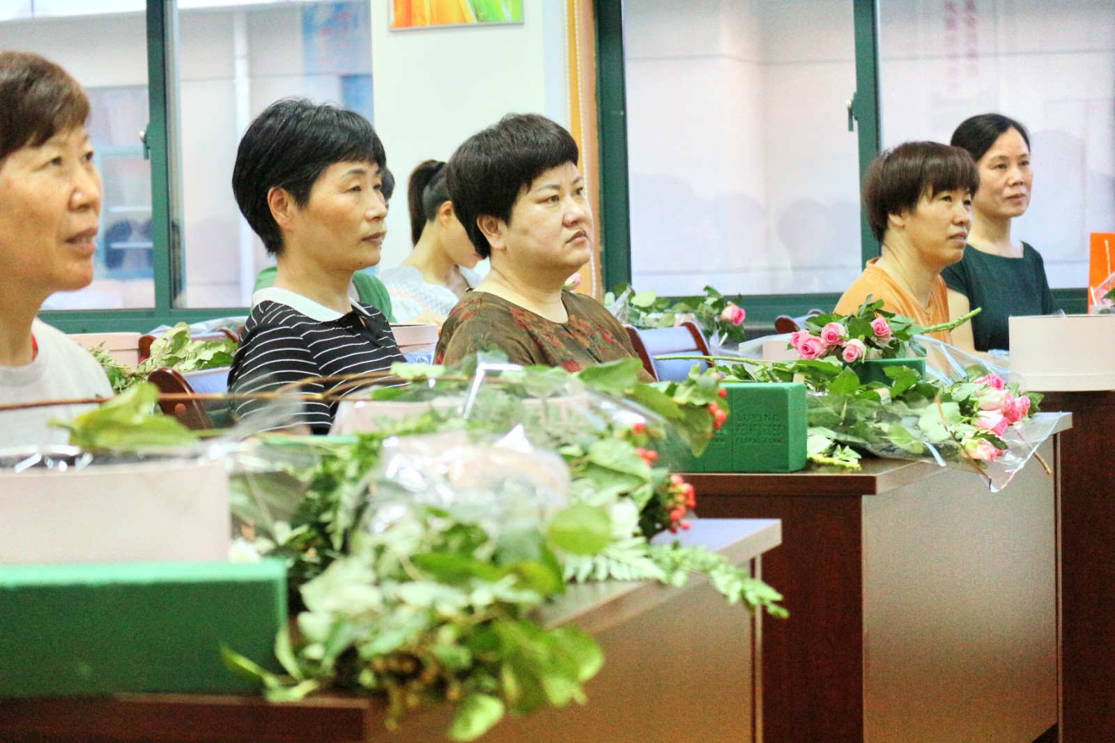 卢老师首先普及了插花的几个要点:一、线条型花材,起整体框架作用,增加插花艺术的层次感;二、块状类花材,玫瑰、桔梗花起主要的画面美观作用。三、散装花材,起填充和固定作用,过渡块状类花材,有画龙点睛的效果。卢老师细心的讲解,引发了学员们浓厚的兴趣。插花是一种很好的修身养性指导,插花时讲究心平气和,神态专注,能够提高人们的精神文化素质和艺术修养。要用“心”与花对话。学员们在插花的过程中认真听老师讲课,学员之间互相探讨并请卢老师指点自己,使自己的作品更加完美。