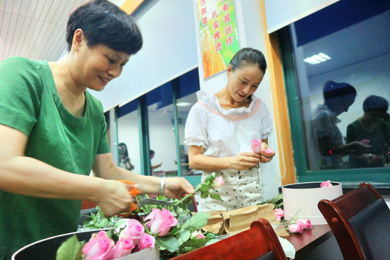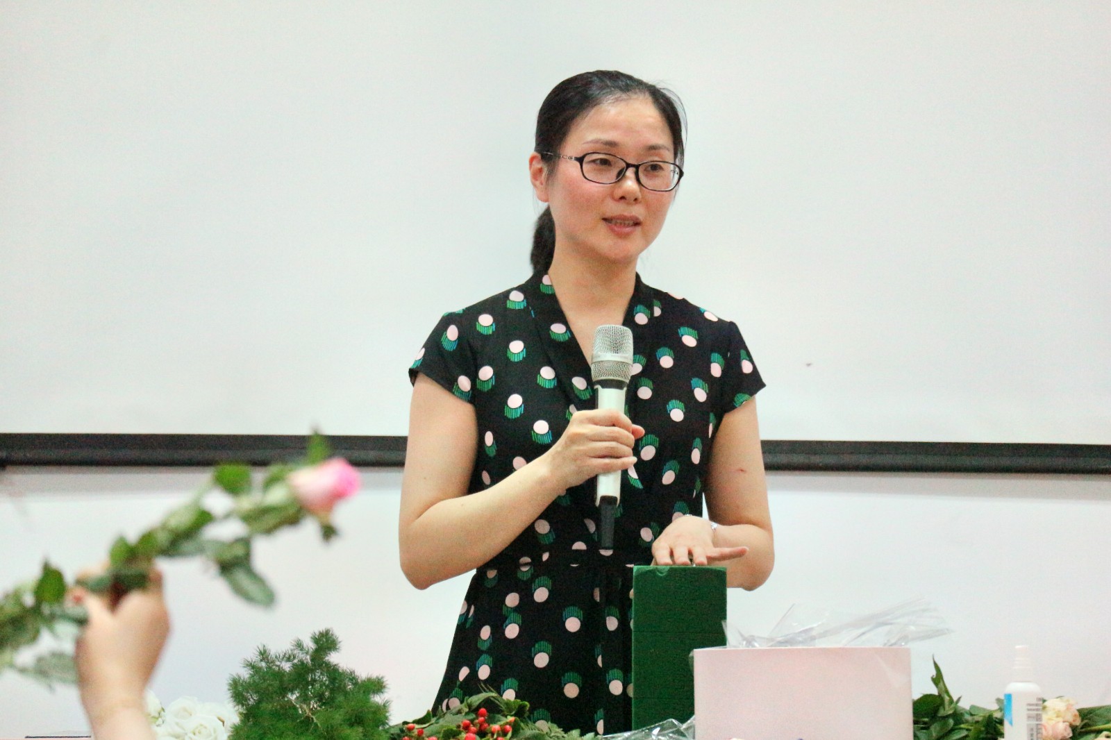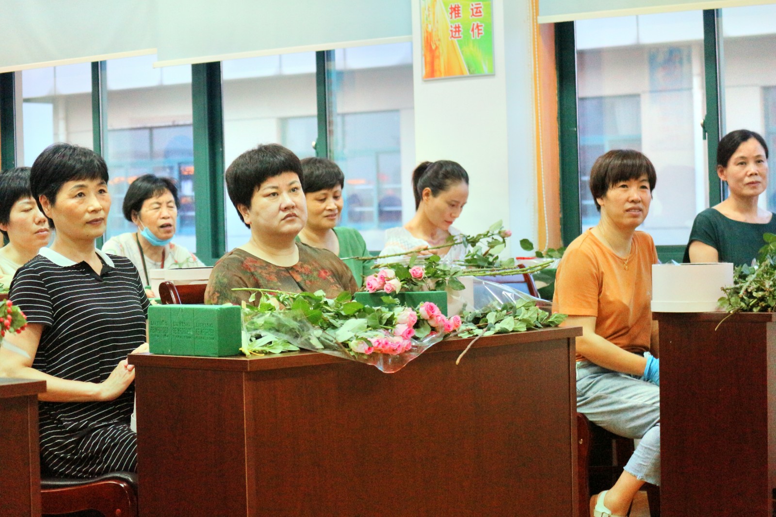 卢老师首先普及了插花的几个要点:一、线条型花材,起整体框架作用,增加插花艺术的层次感;二、块状类花材,玫瑰、桔梗花起主要的画面美观作用。三、散装花材,起填充和固定作用,过渡块状类花材,有画龙点睛的效果。卢老师细心的讲解,引发了学员们浓厚的兴趣。插花是一种很好的修身养性指导,插花时讲究心平气和,神态专注,能够提高人们的精神文化素质和艺术修养。要用“心”与花对话。学员们在插花的过程中认真听老师讲课,学员之间互相探讨并请卢老师指点自己,使自己的作品更加完美。
