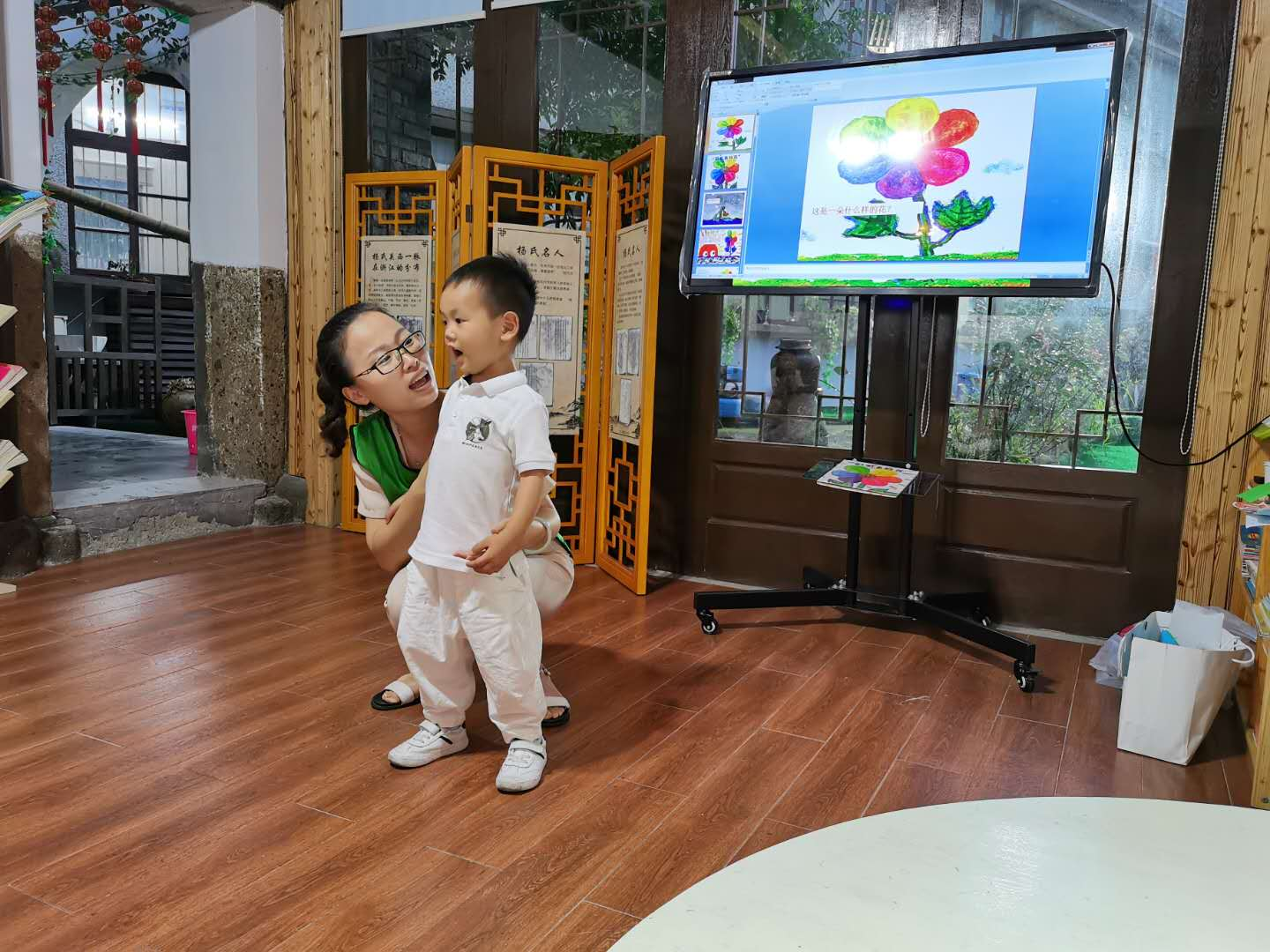 故事会开始了,格格妈妈向小朋友和家长问好后进行自我介绍,然后鼓励孩子进行自我介绍和表演,锻炼孩子们的自信心和表达能力。自我介绍结束后,孩子们围坐在一起,跟着格格妈妈一起开始阅读绘本故事《彩虹色的花》。通过提问,猜想,引导,格格妈妈把小朋友和家长都带入到了绘本的故事里去了。