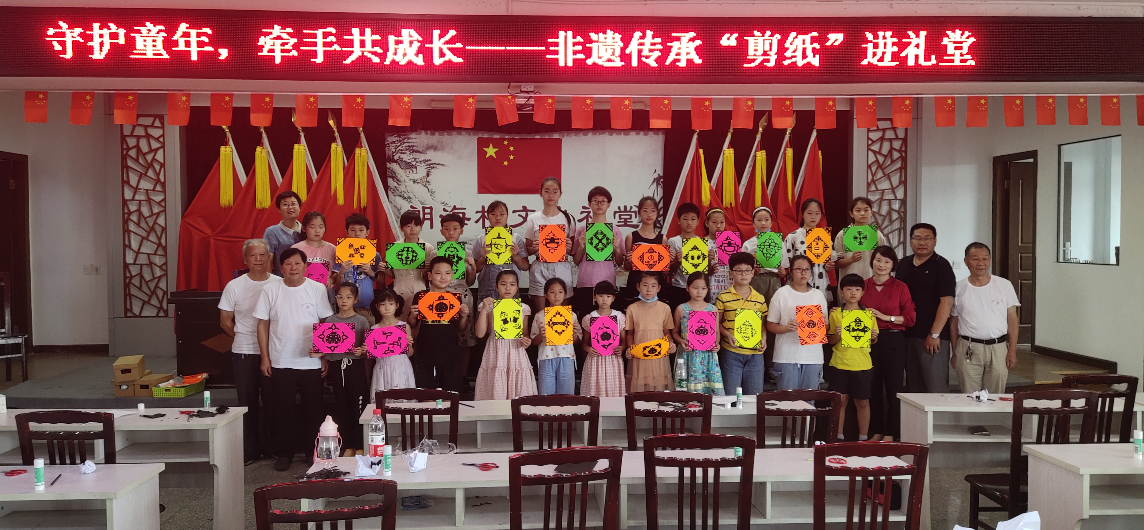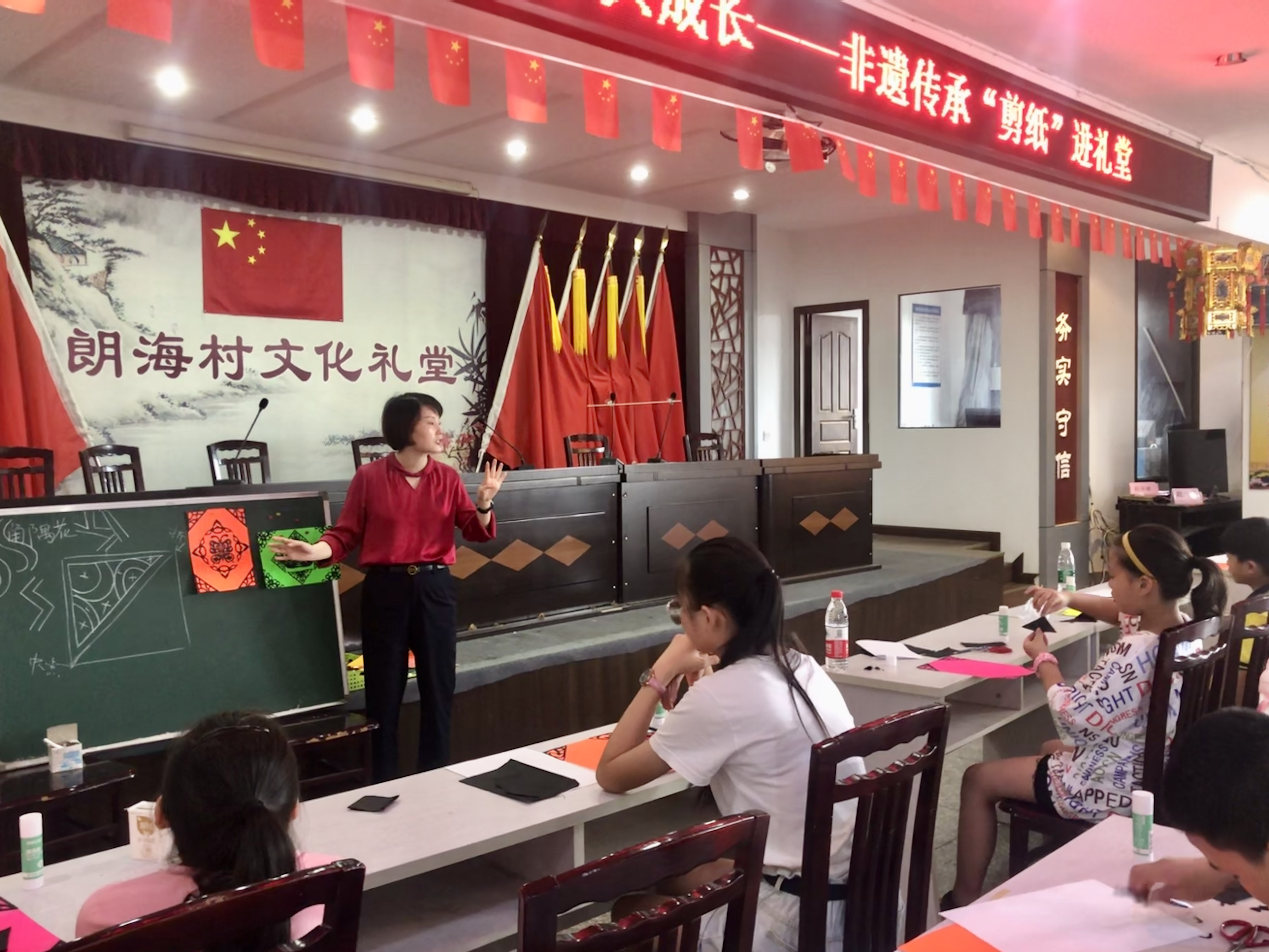 8月4日,为丰富小学生的暑期生活,弘扬中华民族传统文化,小曹娥镇社区教育中心、镇关工委和朗海村党总支开办了主题为“非遗传承‘剪纸’进礼堂”的假日课堂。剪纸课吸引了镇上20名小学生参加。