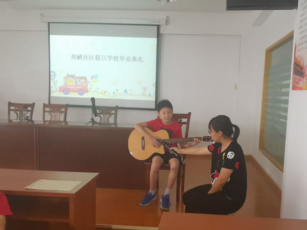 典礼活动由才艺展示和总结表彰两部分组成。第一部分,班上几个有才艺特长的小朋友为大家带来朗诵、吉他等表演,既展现了青少年健康积极的精神面貌,也活跃了现场的氛围。第二部分,社区假日学校负责人朱巧静回顾了本期假日学校的基本内容,点评了每个同学的基本表现,表彰优秀学员,并为每一个受到表彰的同学送上小礼品以示鼓励。最后,社区用镜头为本期学员留下“全家福”,标志着假日学校圆满结束。