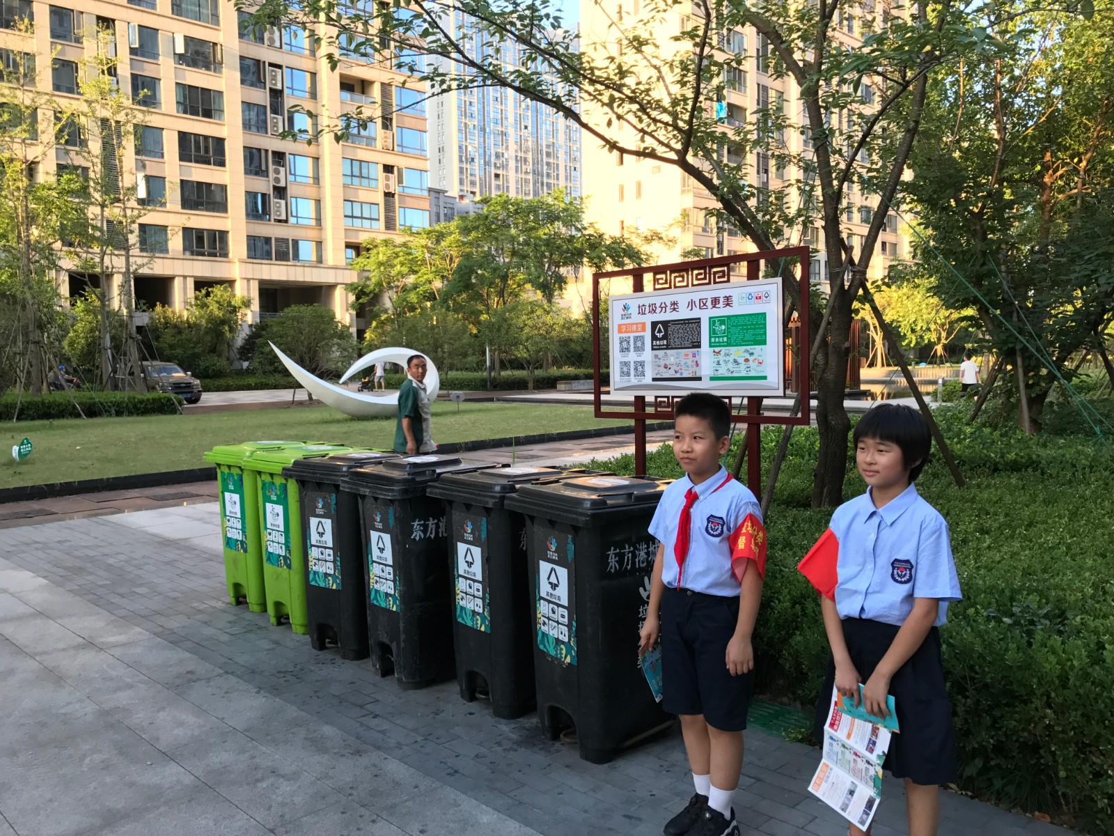 上门宣传+桶边督导,小小志愿者花样喊你垃圾分类。在玫瑰社区的组织下,青少年志愿者们别上红袖章,挨家挨户上门向居民进行垃圾分类宣传工作。“阿姨,您家有在进行垃圾分类嘛?”“爷爷,这是垃圾分类的知识手册,可以帮助您更好分类呢”……让青少年们走进邻里之间,开展宣传工作,可以让居民们在童言童语中更加增强垃圾分类的意识。桶边督导也不能少了小小志愿者的身影。早晚垃圾投放高峰的时间段内,玫瑰社区将报名的青年志愿者们分组安排在点位上,让他们在现场把关居民们的垃圾分类质量。“叔叔,纸巾属于其他垃圾,不能跟厨余垃圾混投呢”“奶奶,这个垃圾袋不是专门的处于垃圾袋,不能降解,属于其他垃圾”……现场的桶边督导不仅可以纠正居民们不正确的垃圾分类投放,也可以让青少年志愿者们在实践中更好掌握垃圾分类知识。