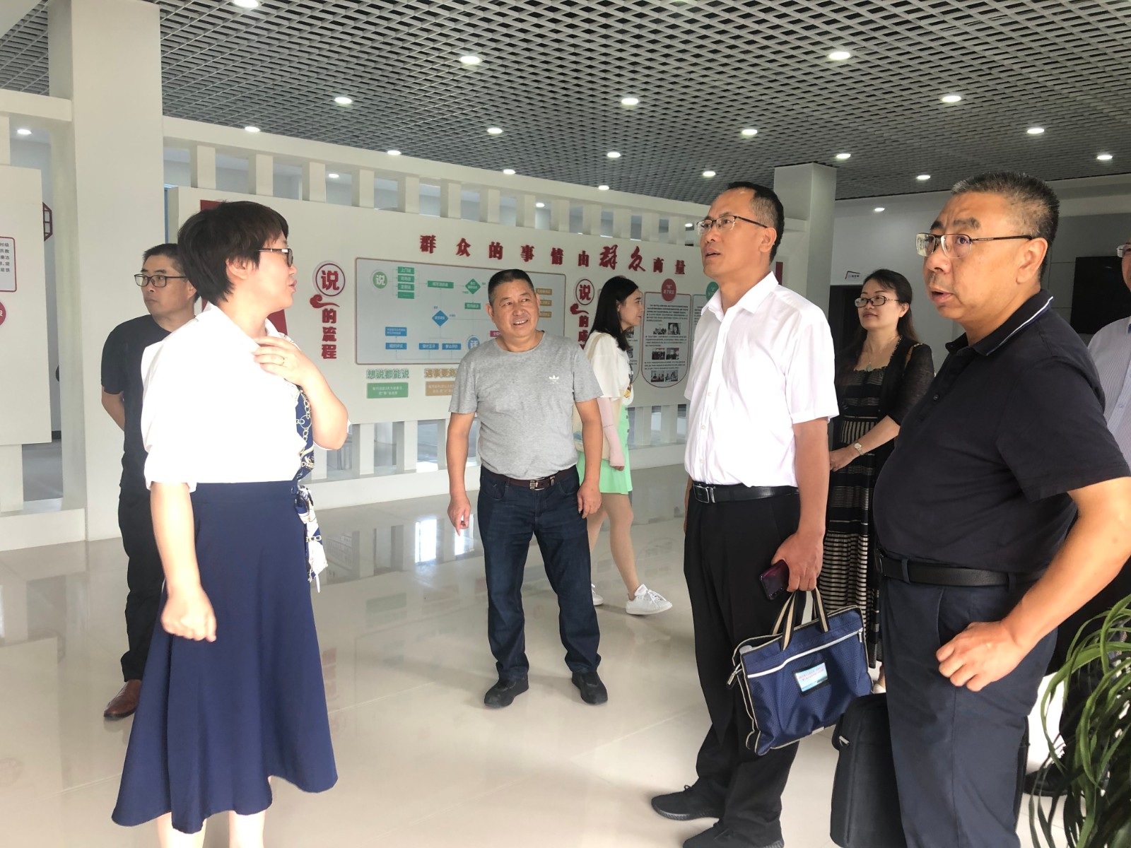 张益峰一行首先参观了西周夏叶村的“村民说事”大厅,齐海燕副局长向调研组介绍了夏叶村的人文历史、文化内涵建设以及夏叶老年学堂的概况。交流会上,齐局长汇报了我县老年教育事业的开展情况以及夏叶老年学堂的推进工作。张益峰充分肯定了我县老年教育事业工作和取得的成绩,并对夏叶老年学堂的下一步工作提出建议。