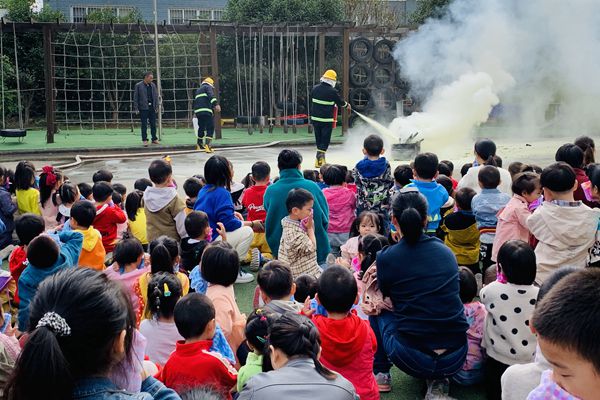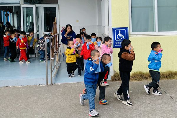 铃铃铃~~~~一声声的警报声围绕着幼儿园响起,各班教师迅速按紧急预案的疏散线路带领幼儿拿起湿毛巾,捂住口鼻,弯腰小步快走,从楼梯迅速且有序下楼。不多时,小朋友们被疏散到安全地带幼儿园前的操场,各班老师马上清点并汇报了班级幼儿人数,确保每位学生安全撤离。随后,消防员为小朋友们讲解灭火器的正确使用方法,并进行现场演示。