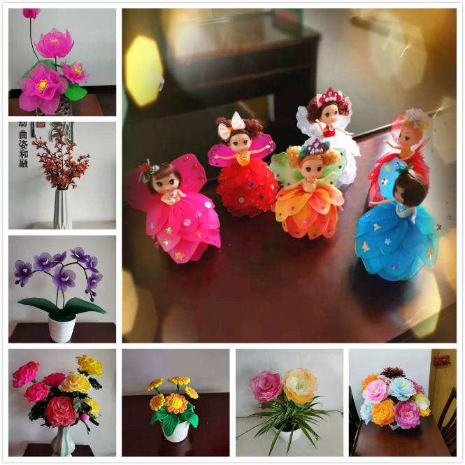 去年,她们在洪佩玉老师的指导下开始学习丝袜花制作,走进了一个五彩斑斓的花世界,用手创造美,用心感受美。丝袜花,即丝网花,以五彩铁丝及丝袜纯手工制作而成,质感极强,花型逼真,犹如鲜花一般,且不易褪色,历久如新,有一种别样的美丽。手工花的制作看似简单,但是需要极大的耐心,课堂上每位学员都认真对待自己的作品,细心地将一片又一片叶子的塑形,完成了一瓣又一瓣的花瓣造型,先扎大花瓣后扎小花瓣,再配上绿叶,扎制成一朵又一朵的美丽花朵。看着一朵朵栩栩如生的丝袜花从自己手里诞生,大家的成就感溢于言表,纷纷与自己的作品合影留念。