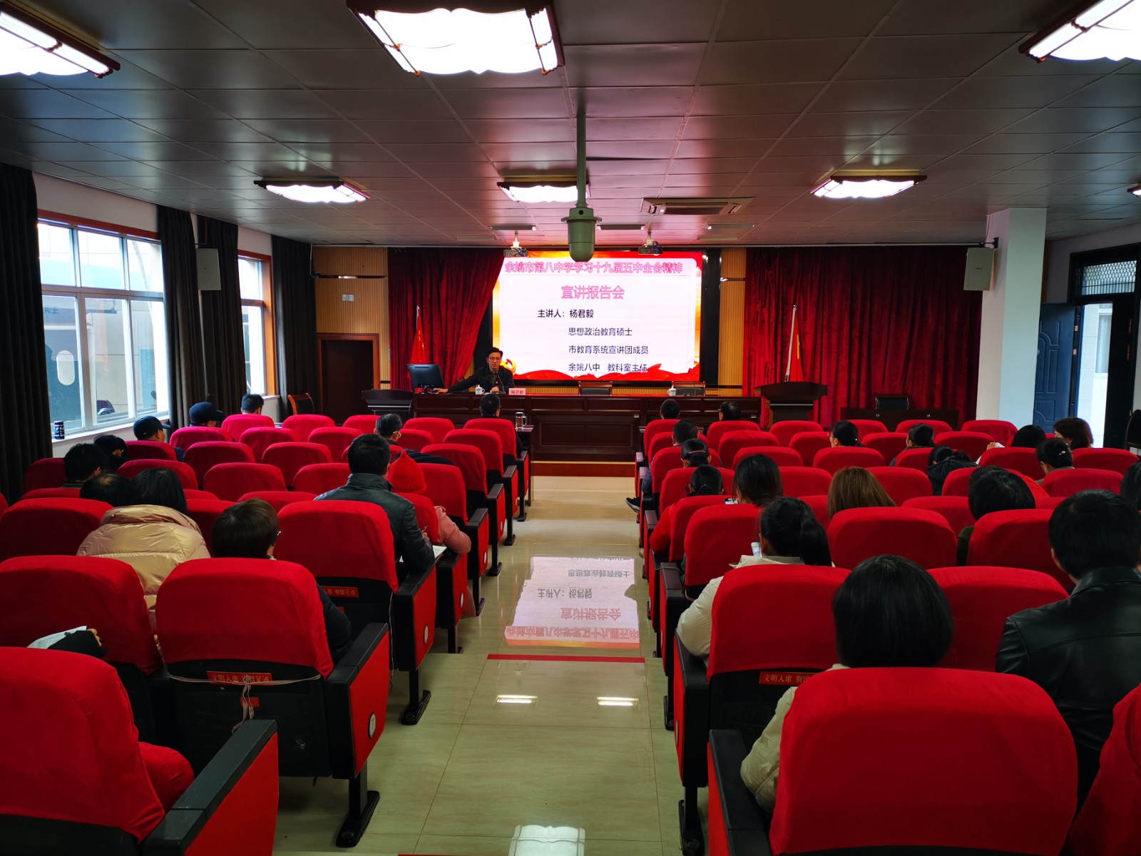 为了迅速兴起学习宣传贯彻党的十九届五中全会精神的热潮,根据余教党〔2020〕39号《中共余姚市教育局委员会关于全市教育系统认真学习宣传贯彻党的十九届五中全会精神的通知》要求,余姚电大(社区学院)专门召开总支委及支部委员会议,对一系列学习宣传行动作了精心部署。12月21日下午,在校报告厅召开了学习十九届五中全会精神专题宣讲报告会,报告会由党总支王尚飞书记主持。全体教师认真聆听了余姚市教育系统讲师团成员、余姚市第八中学教科室主任杨君毅老师所作的宣讲报告。