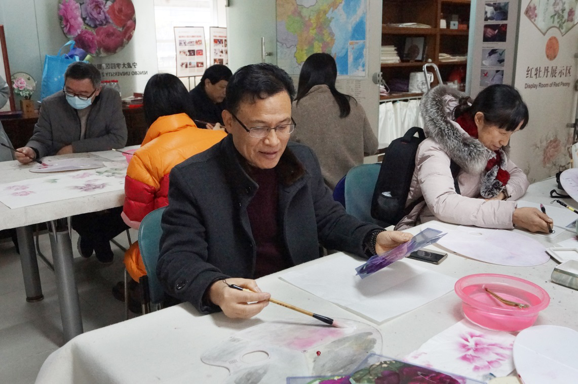 游学第一站是宁波社区大学红牡丹学院。红牡丹学院成立于2017年10月14日,是我国第一所以“国花为媒”的国际教育艺术学院。院长姜红升致力于将牡丹描绘的精华与神韵、文化与品味、艺术与高雅传递给市民,还创造了让外籍人士两小时画出中国牡丹的“红牡丹传奇”。