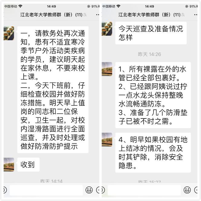 落实各项防范措施。及时组织人员张贴各类警示标志;对暴露在外的水管、龙头加穿“防寒衣”;对主要出入口要采取铺设草垫、地毯等防滑措施,做好处置突发事件的应急准备工作。教务处落实老年学员上放学的交通安全教育,有效防范雨雪、大雾和路面结冰等对学生上下学交通安全的影响。必要情况下,要及时调整教育教学活动,并将相关信息通过短信、微信群等多种渠道告知老年学员。