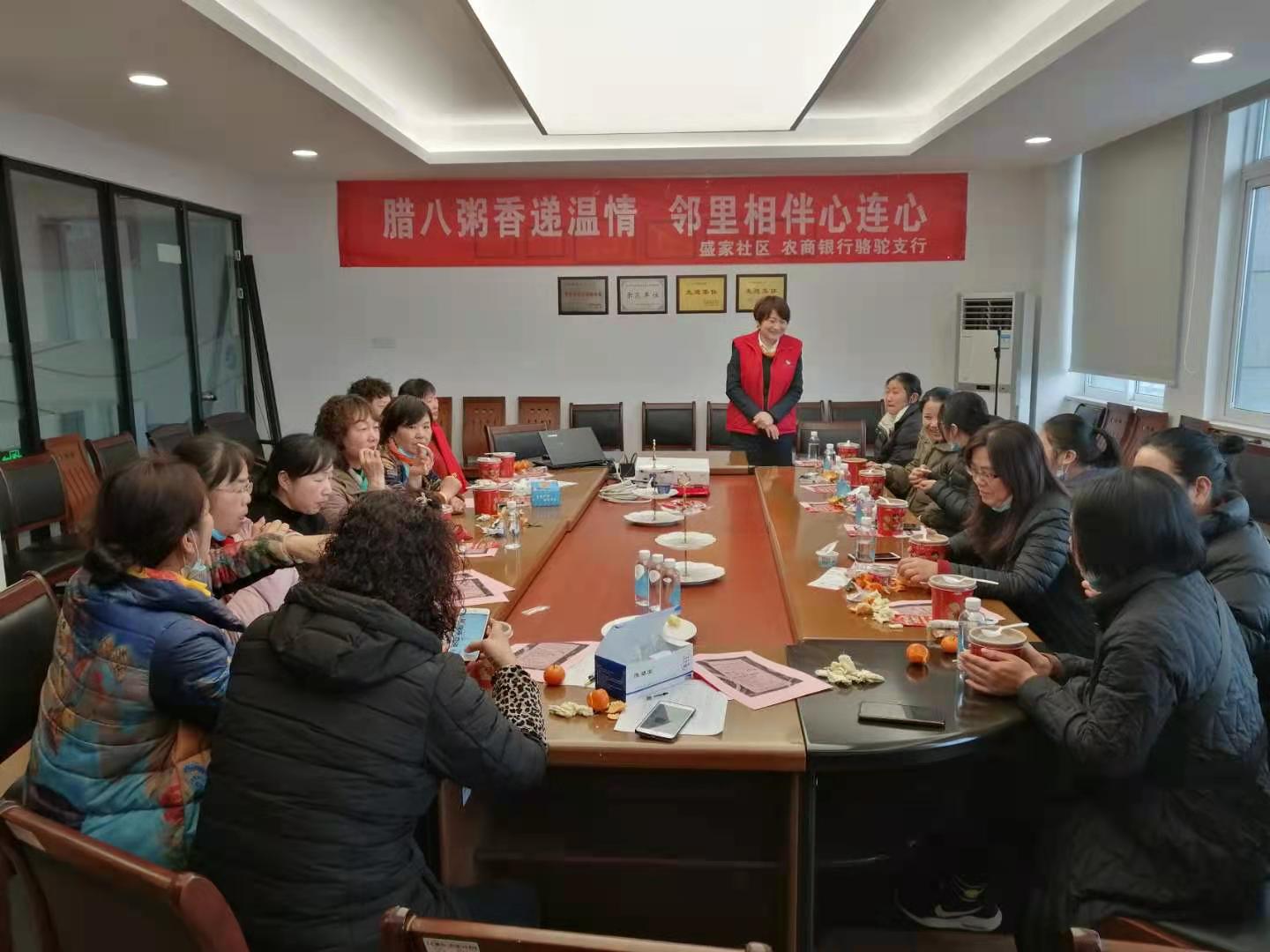 下午2点,盛家社区联合农商银行骆驼支行,邀请社区的妇女代表们,开展了“腊八粥香递温情,邻里相伴心连心”活动。大家齐聚一堂,有序落座,边享用着腊八粥、水果、零食等,边认真倾听了金融讲座。小小的一碗腊八粥,体现了社区对居民的关爱及浓浓的邻里情,代表着社区的一份心意,也寄托着社区对大家的新春祝福。