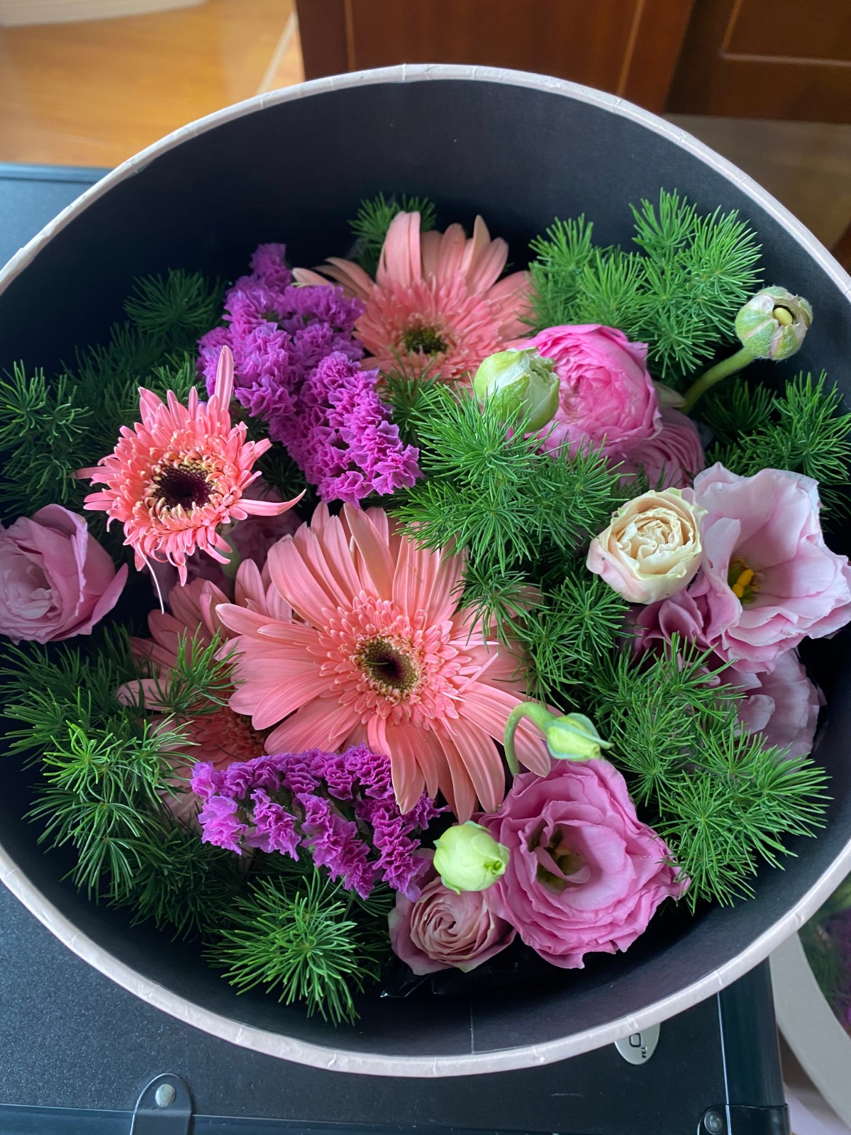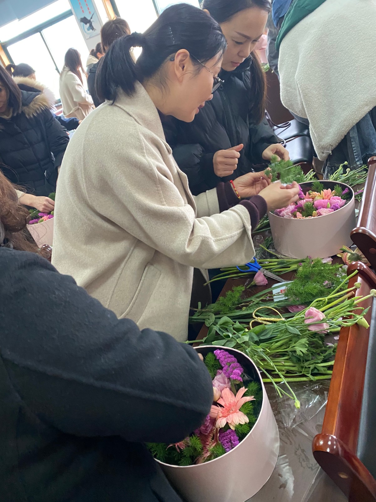 随后进行的是插花培训,花艺老师为老师们准备好了每人一份鲜花:“有非洲菊、洋桔梗、勿忘我、洋牡丹和蓬莱松”......花盒、玻璃纸和花泥等材料。花艺老师首先为大家简单介绍了花束的特点及注意事项,然后开始教大家插花,老师一边讲解一边示范,台下的老师们也跟随着花艺老师摆弄着手里的鲜花;老师说“花艺讲究的是层次感,需要插出高低有致的花艺,剪枝的时候可以先比划再剪枝,要舍得剪。”经过老师们的精心布局,一盒盒具有独特韵味的花束就制作完成了,大家一个劲儿的互相欣赏着花盒,心中满满的成就感。