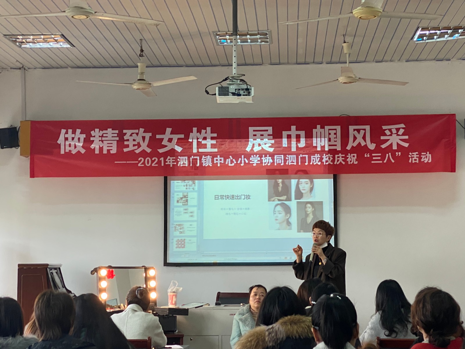 三八妇女节即国际劳动妇女节,也是广大妇女的节日。为了体现学校工会对女同胞的特别关爱,35日与泗门镇中心小学一起举行了“精致女性  展巾帼风采”为主题的庆三八联谊活动。本次活动在泗门成校四楼培训教室举行,活动分职业妆实践操作、插花实践操作和礼仪培训三大内容。