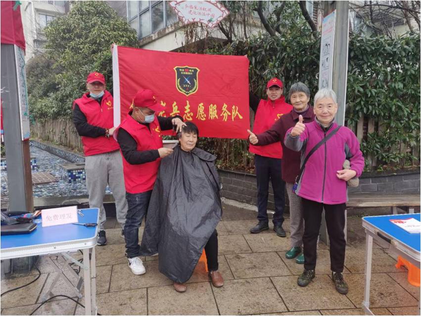 虽然下着淅淅沥沥的小雨,但是叔叔阿姨们看到我们在做准备工作,还时不时的帮我们搬个凳子。大家耐心的等耐,有序的排队,第一位理发的阿姨,坐下还没两分钟,就竖起大拇指说:“这位志愿者技术很好呀,他一上手熟练程度就可以看出来!”阿姨对我们理发的志愿者啧啧称赞,理完发后还打电话给她的小姐妹叫他们过来排队呢!临走前还不忘跟我们志愿者合影,可爱的阿姨温暖人心!