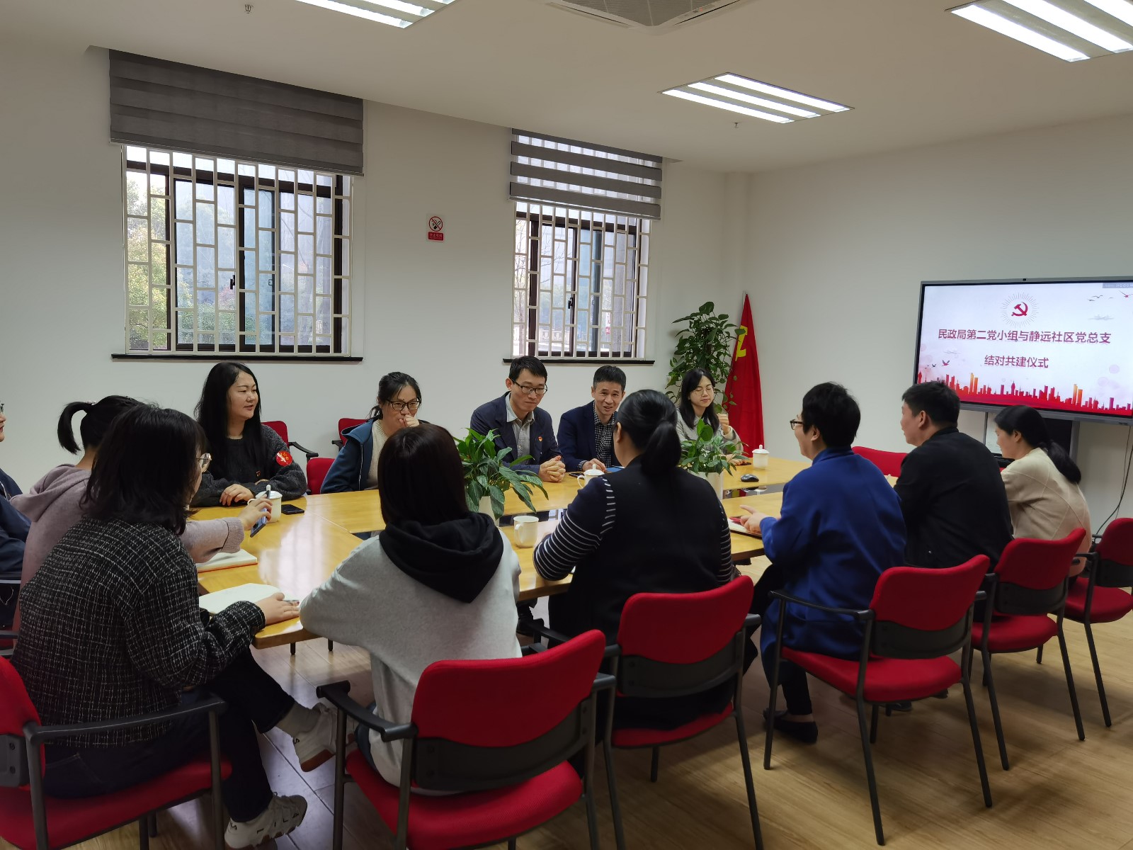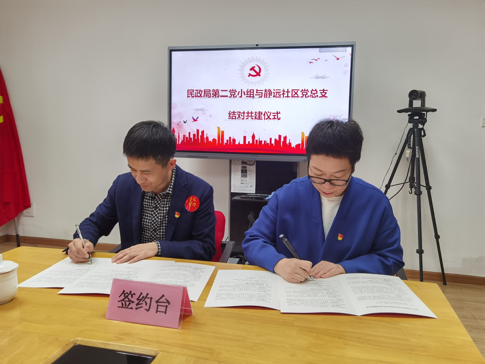 3月30日上午,为充分发挥机关事业单位党组织和党员干部在社区党建和社区建设中的积极作用,进一步创新党建工作载体,提高党建工作水平,进一步打造第二党小组“星火聚力”党建品牌,区民政局机关党支部第二党小组与静远社区党总支开展结对共建签约活动。