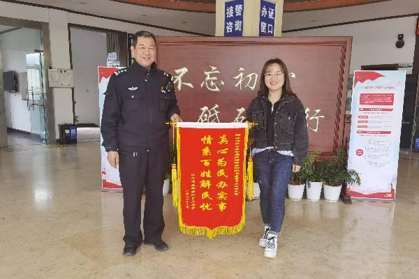 “靳警官,这是我们代表居民赠给您的,感谢您解决了小区一直以来的聚众赌博问题。”红梅社区书记翟晓嫣边说边将锦旗递到孔浦派出所靳宜京警官手上。