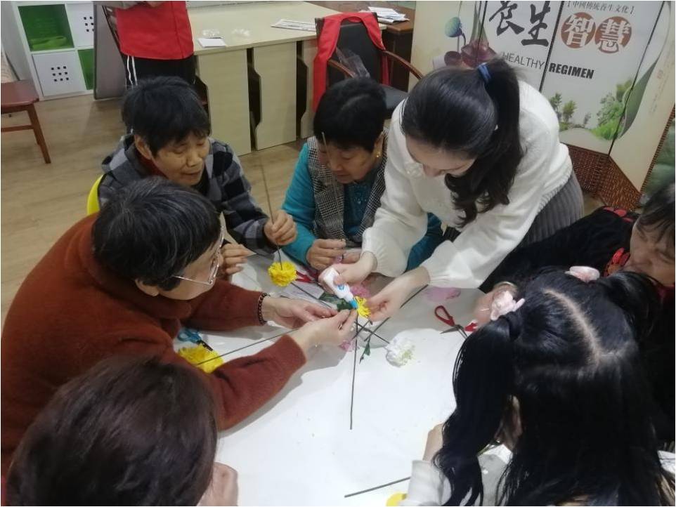 4月8日上午,鸿盛社区组织辖区居民开展建党100周年系列活动之——“做纸花,学党史”活动。活动现场,在社区工作人员的指导下,阿姨们拿起皱纹纸、剪刀、胶带等制作纸花的材料和工具,仔细地进行折叠、裁剪、定型等各个程序,最后将折好的纸花粘在枝棒上。经过近1小时的制作,一朵朵盛开的“菊花”在大家手中绽放。每一朵素雅的“菊花”都凝聚着阿姨们对革命先烈的一片缅怀之情,一份崇敬之意。前来参加本次活动的李阿姨说:“希望社区每年都能组织这样的活动,我们自己亲手制作纸花,一边做一边把自己的心意折进纸花里,既能表达我们对先人的缅怀和悼念,又能为保护环境贡献自己的一份力量。”