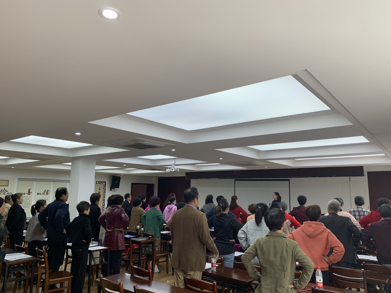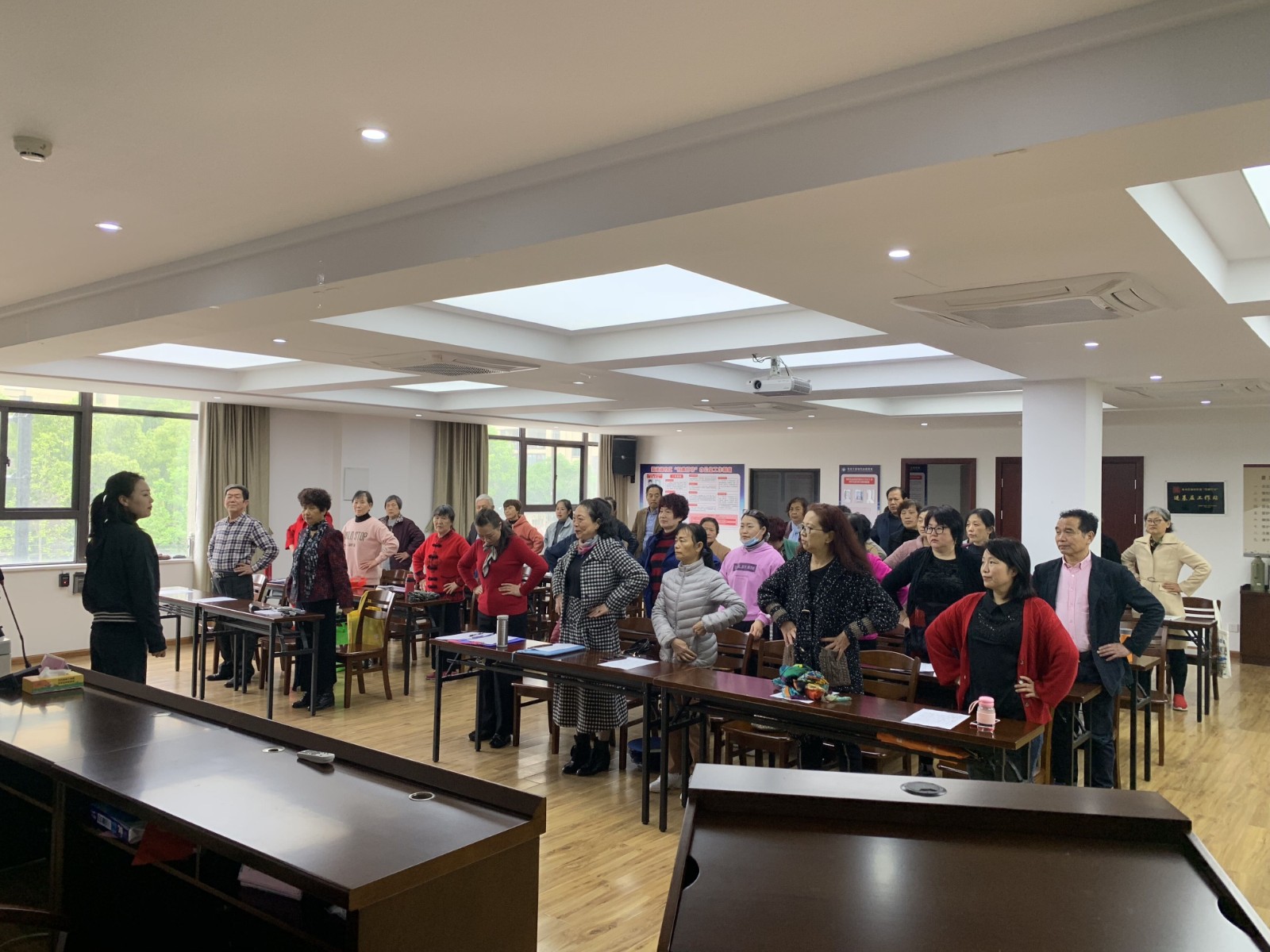 4月14上午箭港湖社区“箭湖之声”合唱队在社区二楼例行进行歌唱练习。