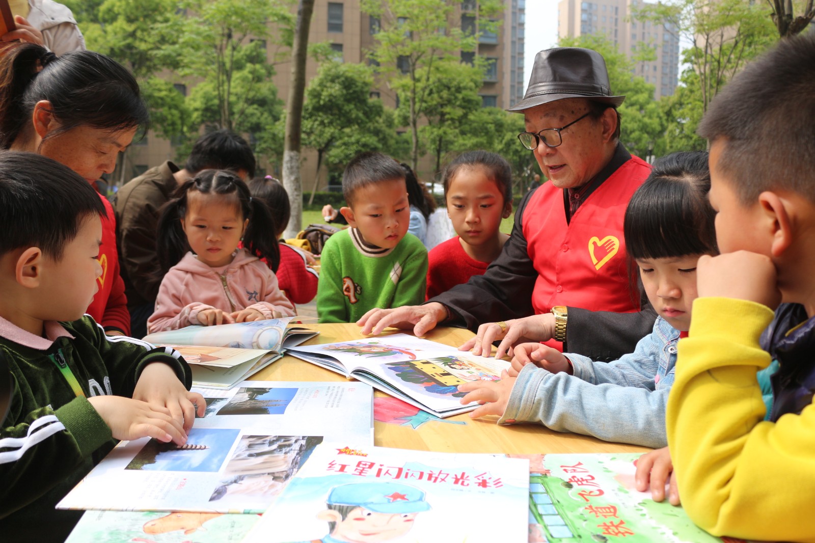 在红色阅读区,党员志愿者正在为孩子们讲“绘本中国·革命圣地新故事”系列图书和爱国主义教育绘本,《探寻湖面的飞船》、《拜访山洞的精灵》等一个个充满正能量的故事带着孩子们走进中国共产党革命圣地,让红色故事在孩子心中种下一颗颗红色种子。在书签和蒲扇手工制作区,孩子们和家长共同动手巧制作,用一朵朵美丽的干花制成干花书签,用颜料绘出美丽的风景和温暖的家。在这个周末,书香飘进小区,孩子们拿到了心爱的书籍,还与志愿者、父母一起共读红色故事,了解小小英雄的事迹,让爱国教育从小深植到他们的心灵。