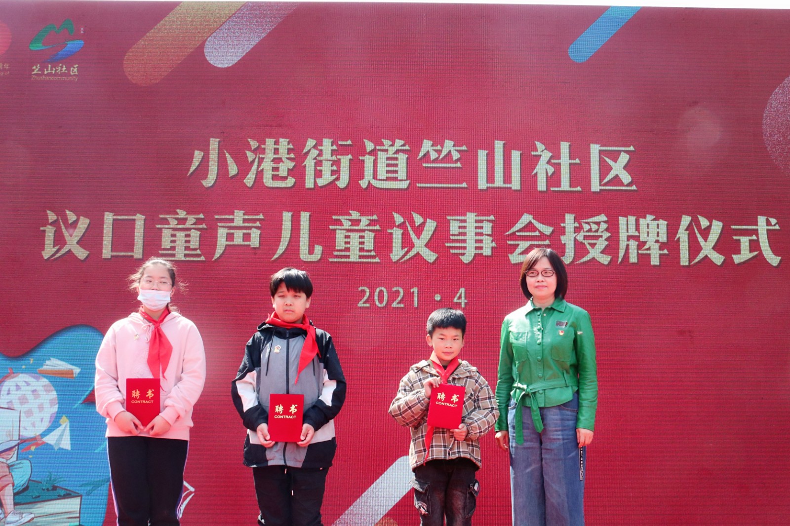 竺山社区为推进儿童友好社区建设的全面发展,培养儿童主人翁意识,从儿童的视角出发,让儿童的想法被看见,儿童的声音被听见,成立了竺山社区“议口童声”儿童议事会,现场邀请了小港街道妇联主席赵明君为儿童议事会授牌,并向议事会的会长杨舒宇和副会长许艺腾、沃佳彤发放聘书、授予勋章。