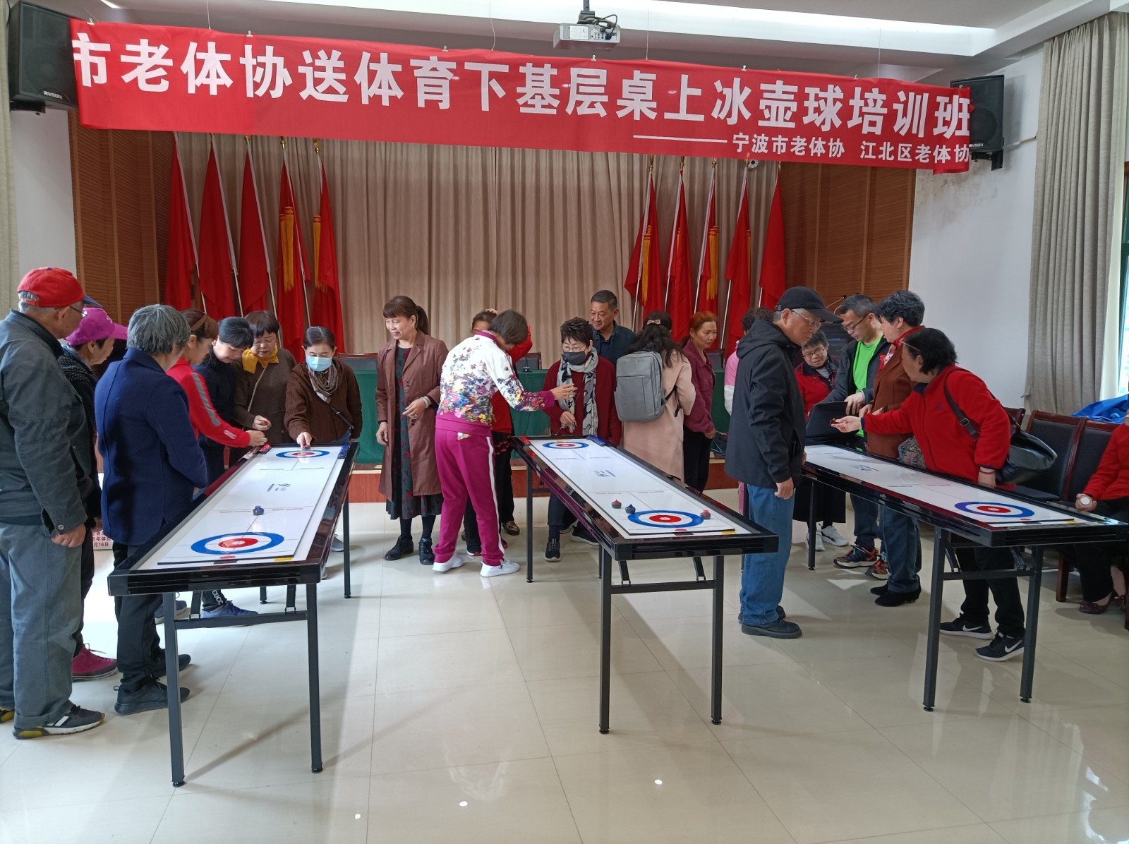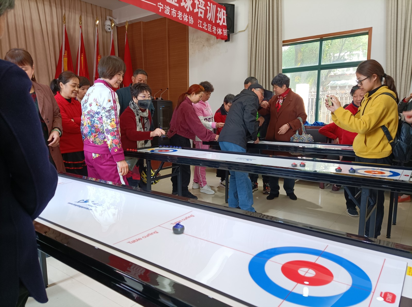 众所周知,冰壶球运动是奥运比赛经典项目之一,以其精巧的力量使用,默契的团队配合,绝妙的战术策划而令人着迷。为了能让更多人群能突破场地、设施的限制体验到冰壶球的乐趣,桌上冰壶球应运而生,2021年4月16日,云鹭湾社区组织社区居民参加慈城成人学校的冰壶球培训课。