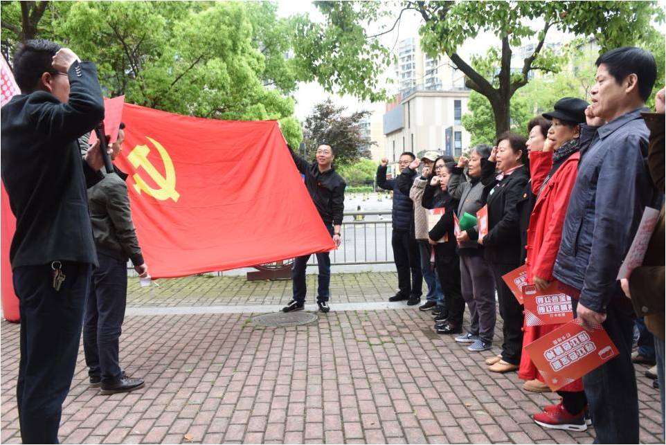 我志愿加入中国共产党,拥护党的纲领,遵守党的章程,履行党员义务……”活动开始前,亲亲社区40余名党员在联社干部李宏峰的带领下重温入党誓词,面对鲜红的党旗,大家举起右手庄严宣誓,铿锵豪迈的誓言使每一位党员仿佛回到了入党的那一刻。在场的社区党员表示,“面对党旗再次宣誓,又一次回味神圣而又庄严的入党时刻,是一件很有意义的事。”