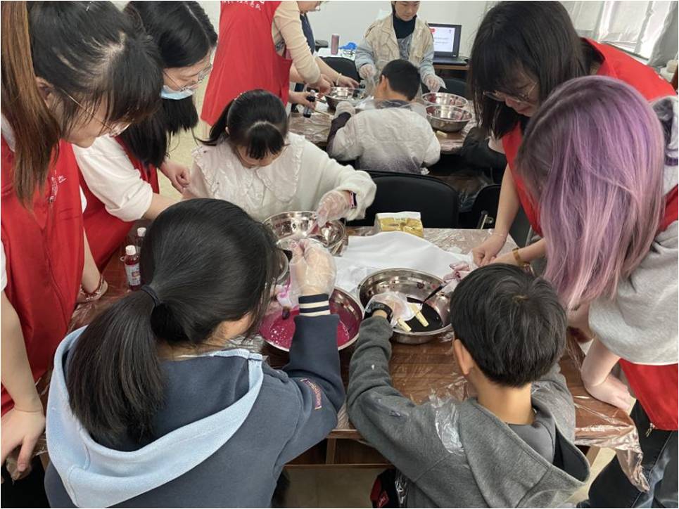 活动中,首先由大学生志愿者给小朋友们宣讲扎染文化和方法。社区小朋友将带来的家中多余果蔬汇集在一起,由志愿者制作染料。志愿者引导社区小朋友将棉麻布料进行造型设计,并借助皮筋将其捆扎,通过发挥小朋友的想象力和艺术创造力,亲自制作出其独有的花纹。最后小朋友将已经创作完毕的棉麻布浸入准备好的染料中,上色,过后拿出,浸入加入白醋或盐的水中固色。